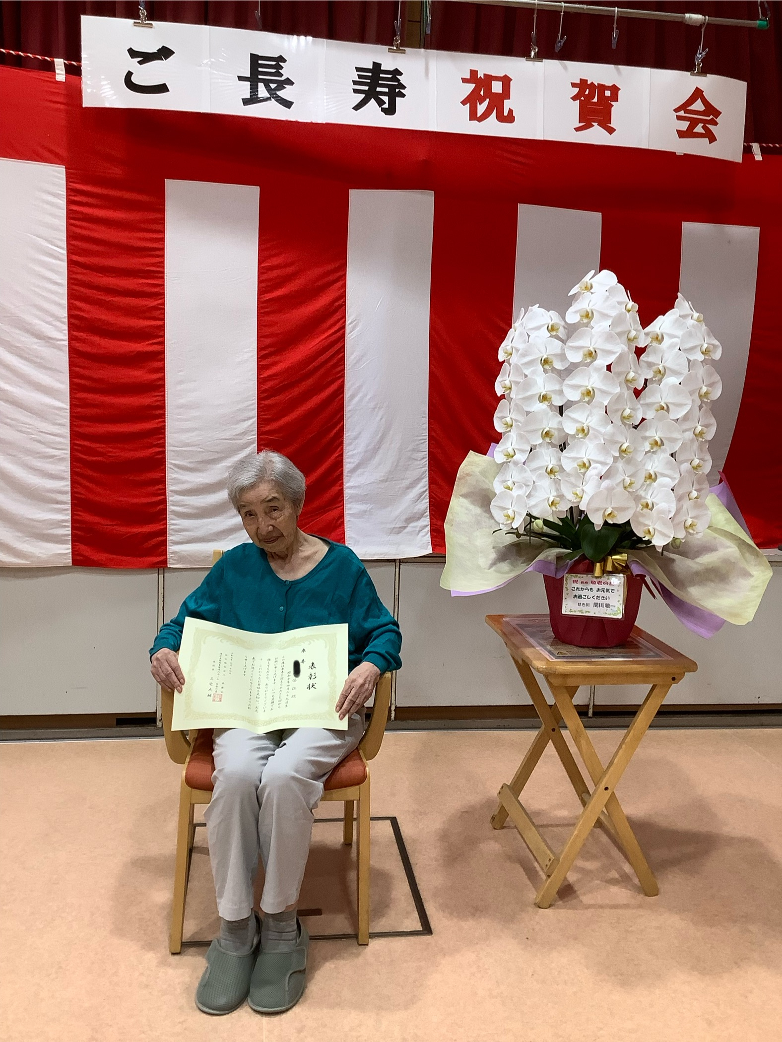 今年はK様が卒寿を迎えられました。施設長から表彰式を受け取られ、嬉しそうな顔が見られました。