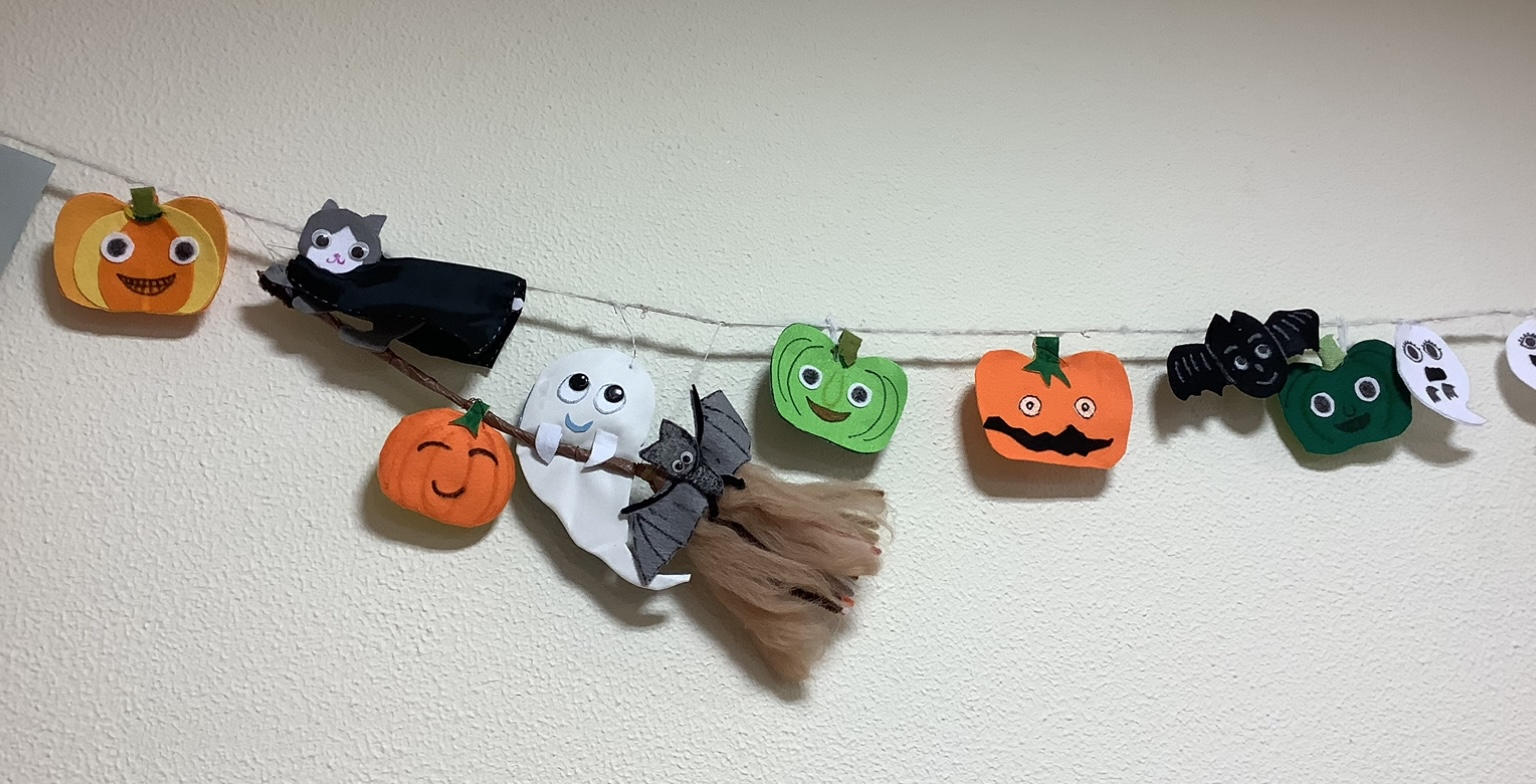 白金の森の介護二課では可愛いハロウィンの飾りを作りました。