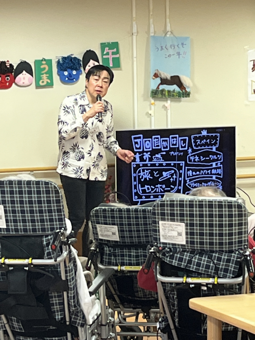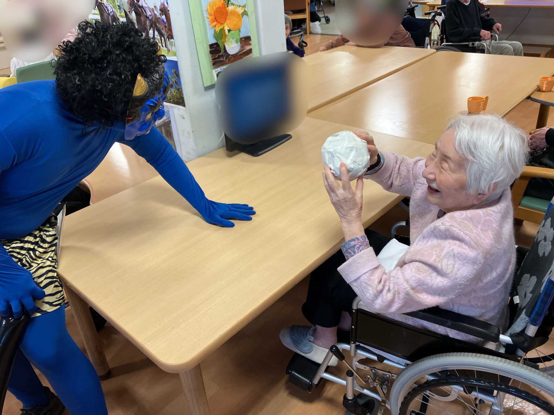 ご入居者の皆様、フロアに鬼が来た瞬間、怖がる方はほとんどおらず「こっちきてー。投げたいー。」と待ち構えておられました。