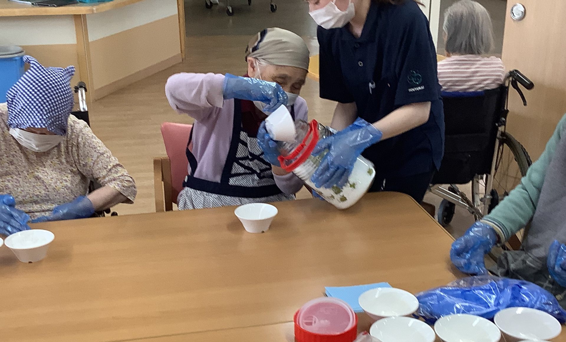 好きな柄のエプロンと三角巾を選んで身に着けて頂きました。