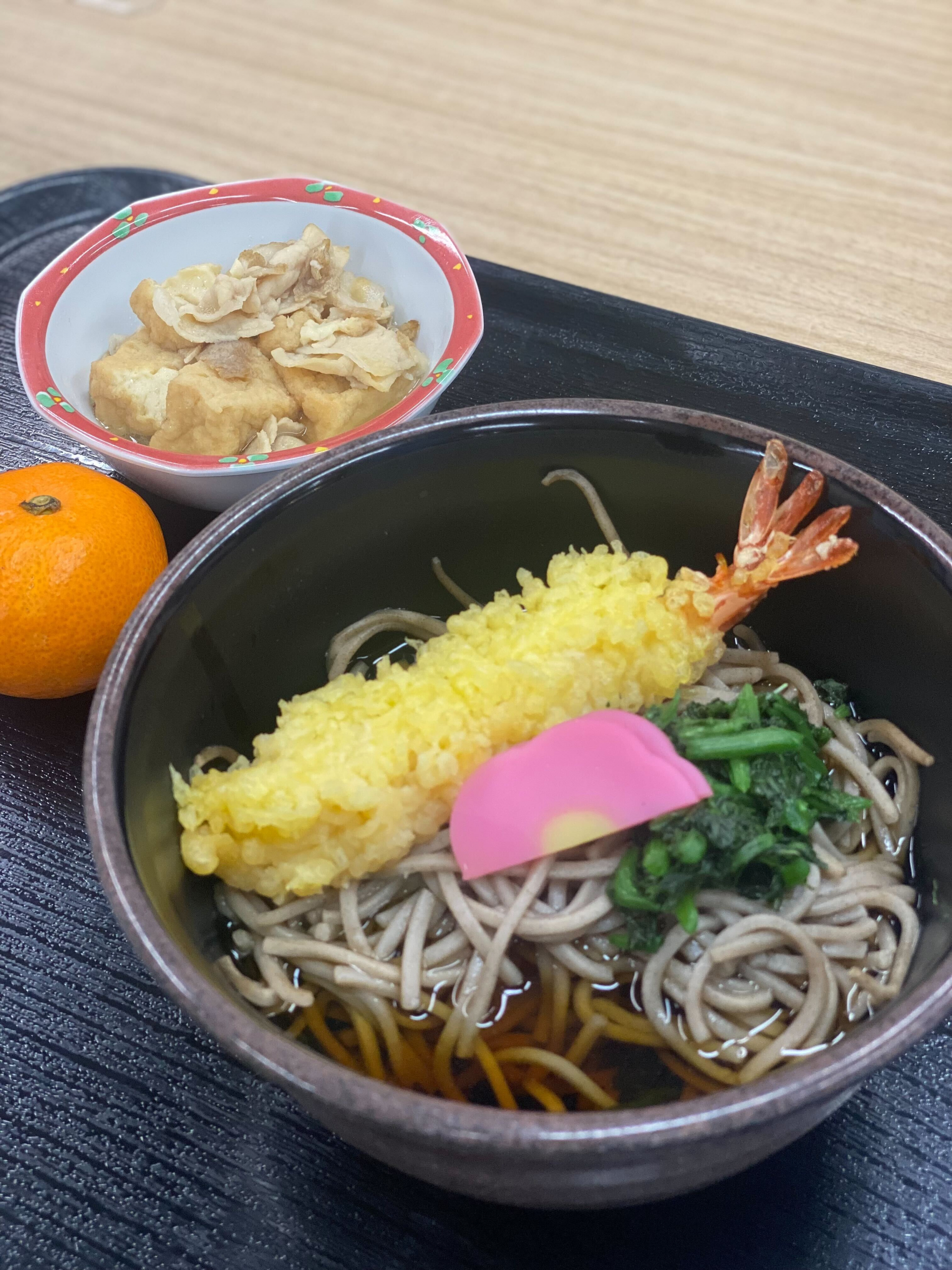 本日の夕食は年越し蕎麦です。大きな天ぷらが乗っていてボリューム満点でした♪