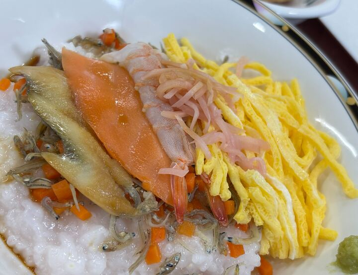 ほんのりピンク色に色づいたご飯に、錦糸卵やえびを彩りよくトッピング。見た目も華やかで、まるで春のお花畑のような一品です。