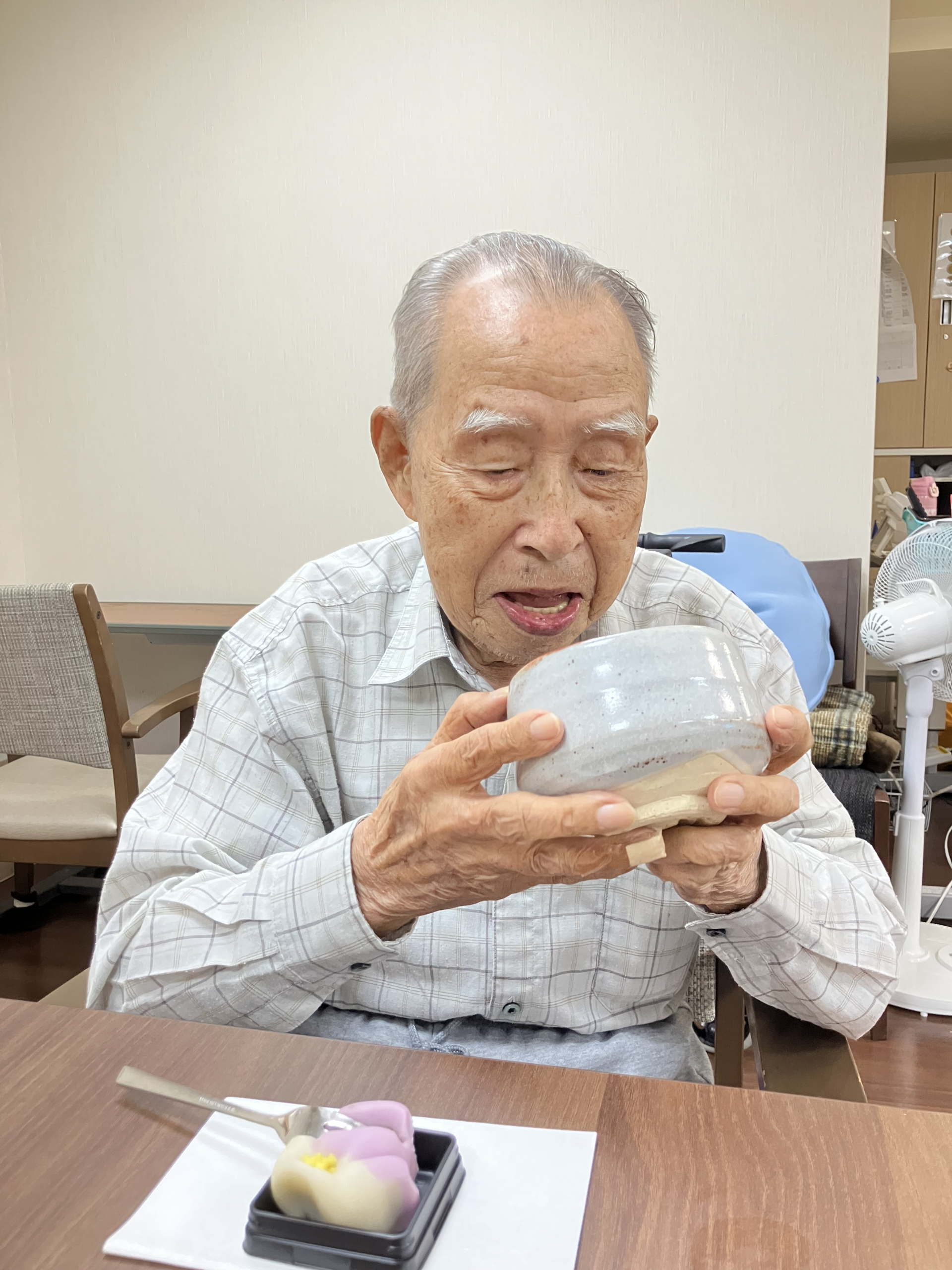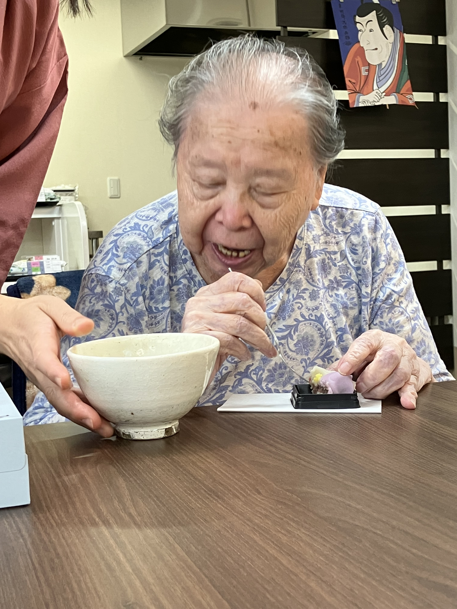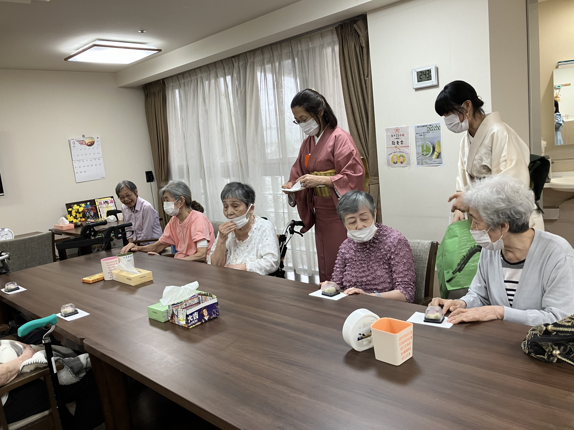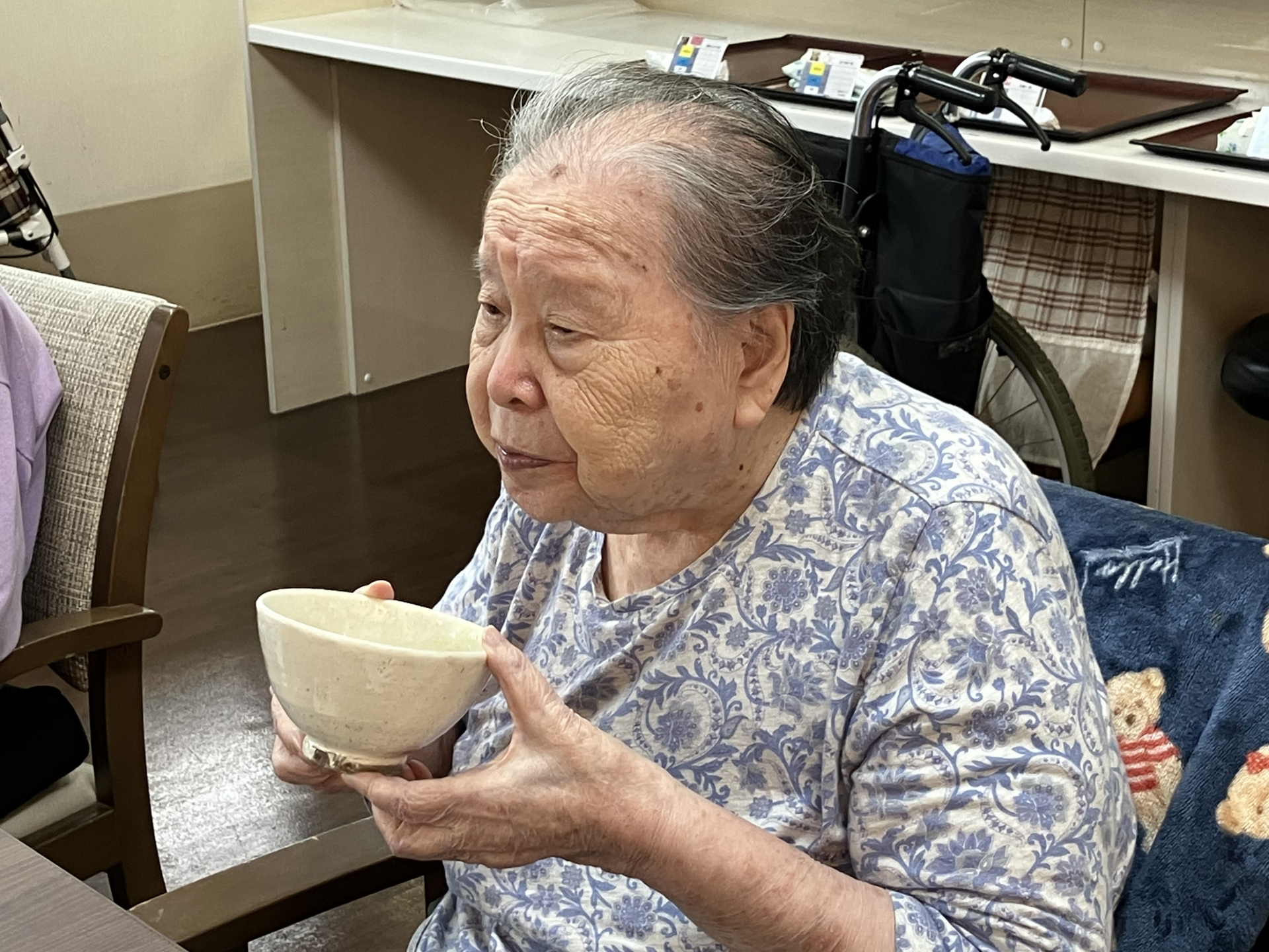 後半のお抹茶会は、お着物を着た栄養士さんと機能訓練士さんが、各ユニットを回っておもてなし![]()