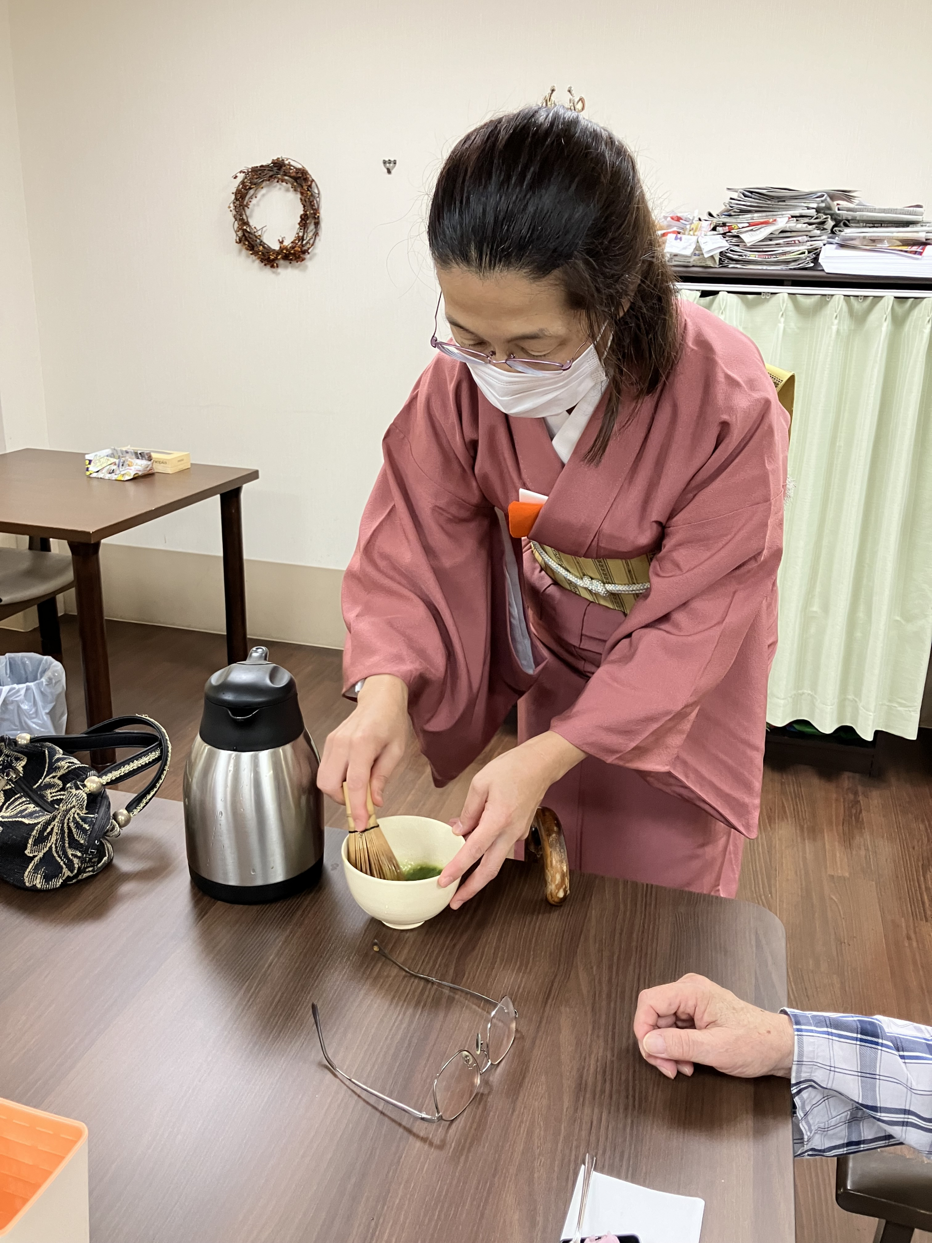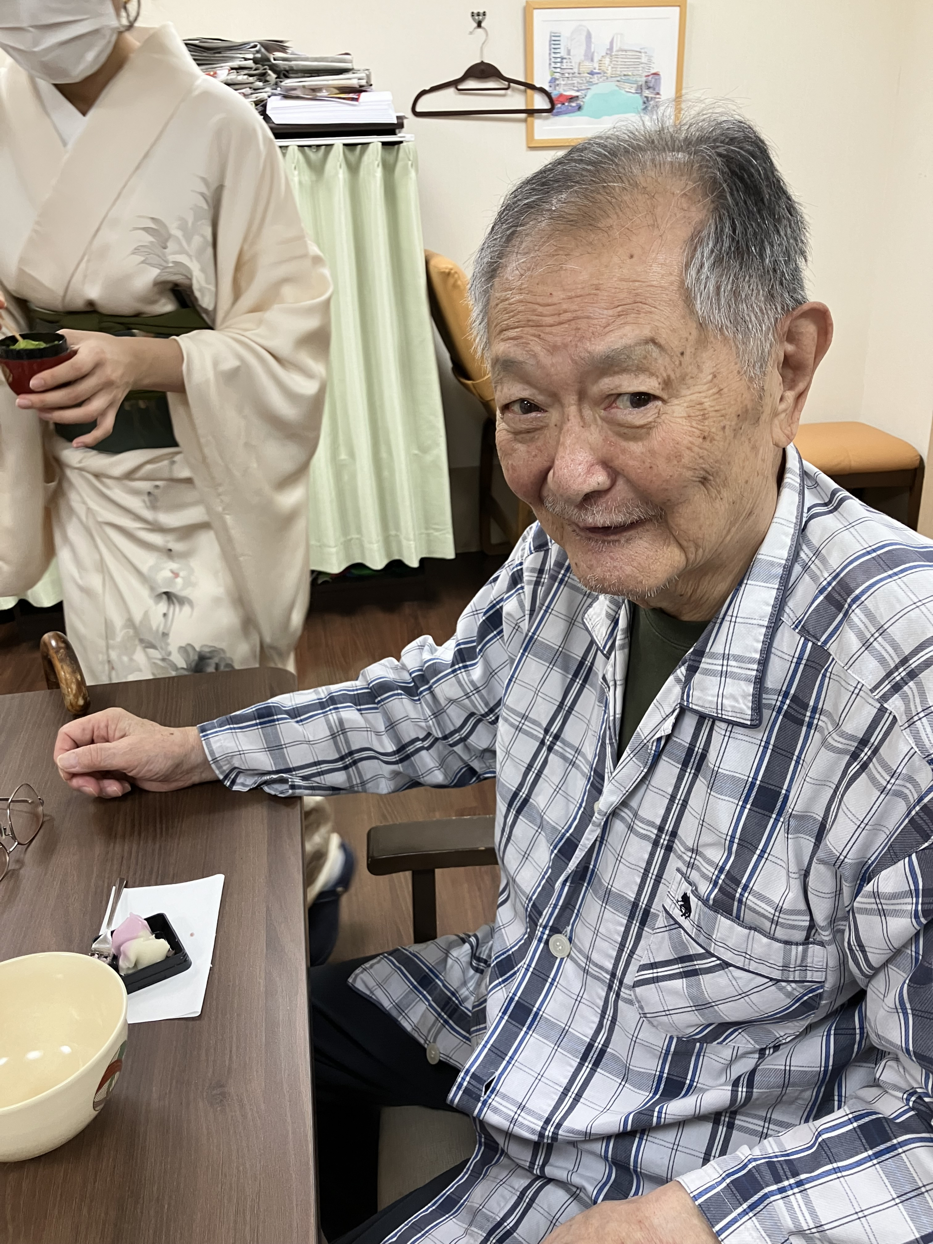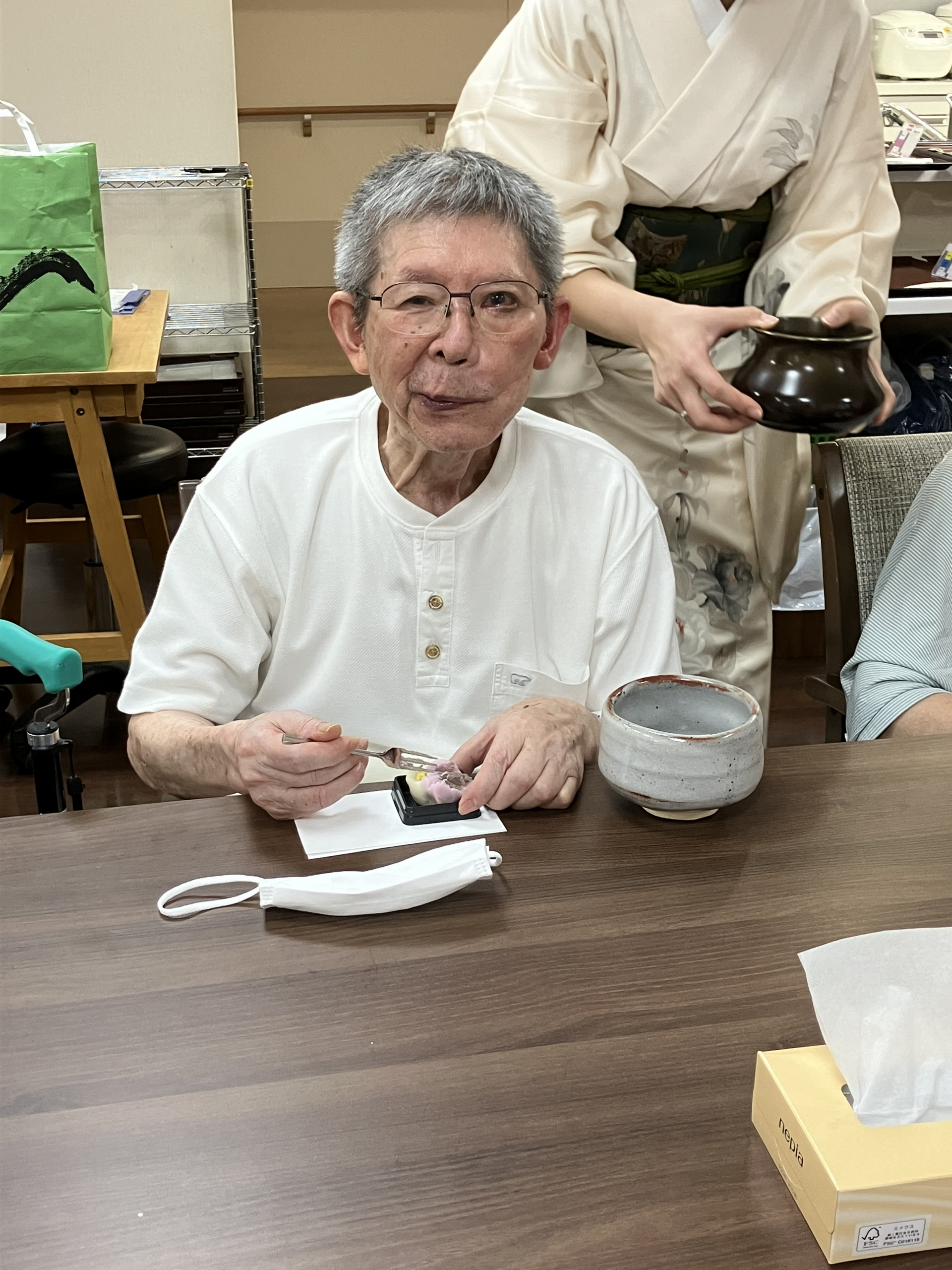 後半のお抹茶会は、お着物を着た栄養士さんと機能訓練士さんが、各ユニットを回っておもてなし![]()