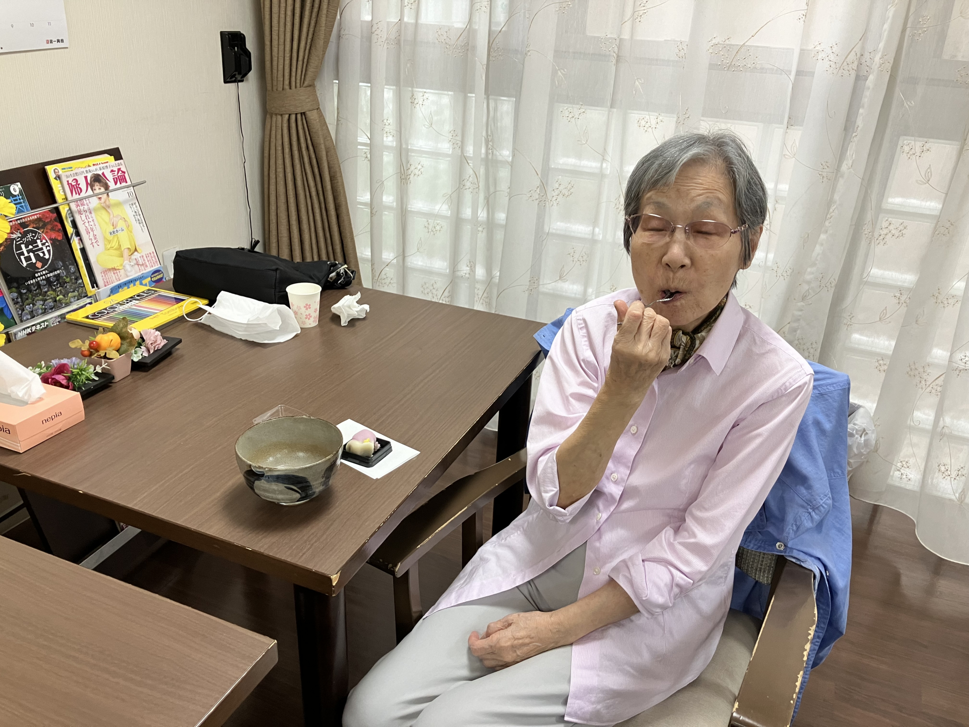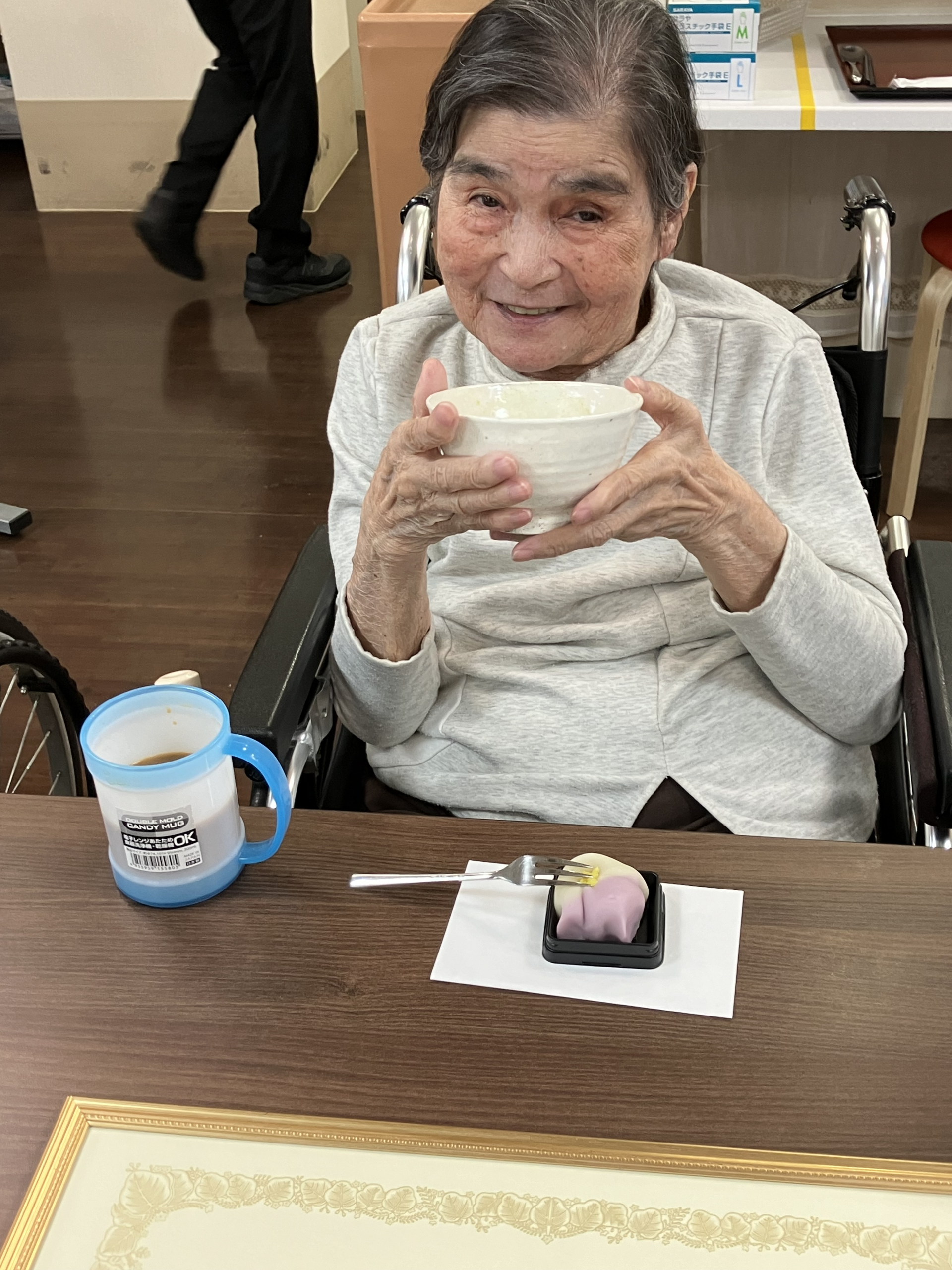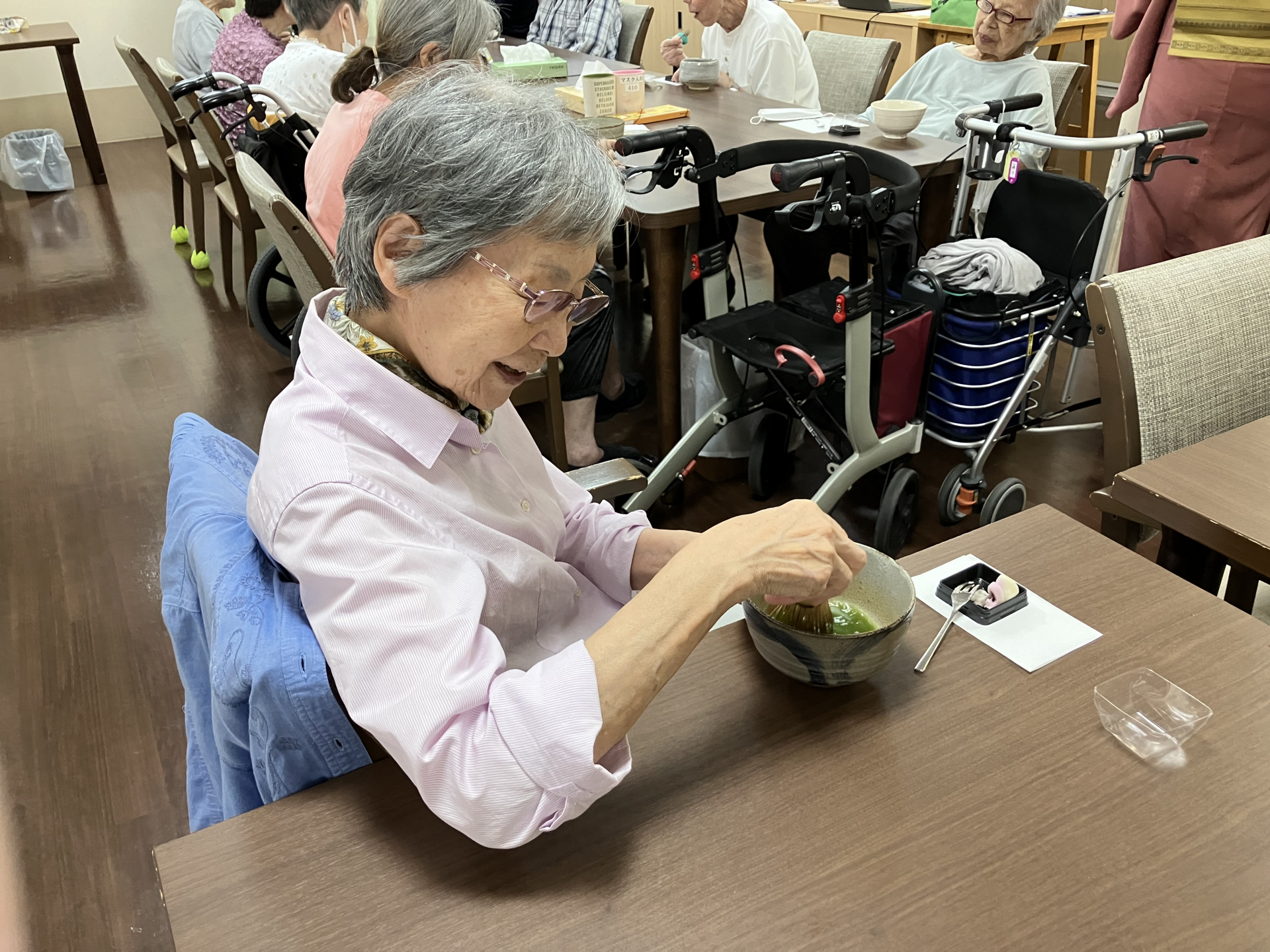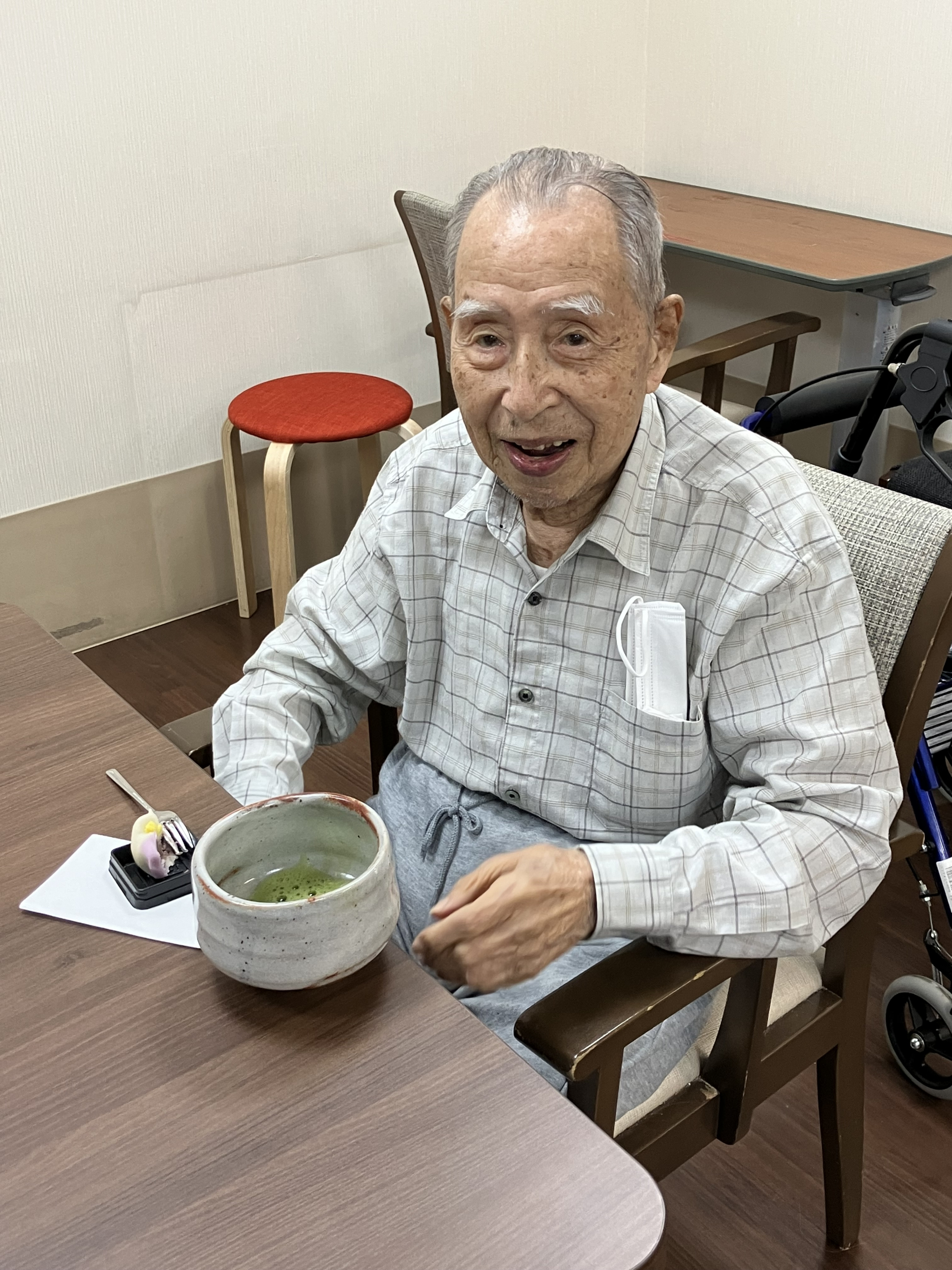 後半のお抹茶会は、お着物を着た栄養士さんと機能訓練士さんが、各ユニットを回っておもてなし![]()
