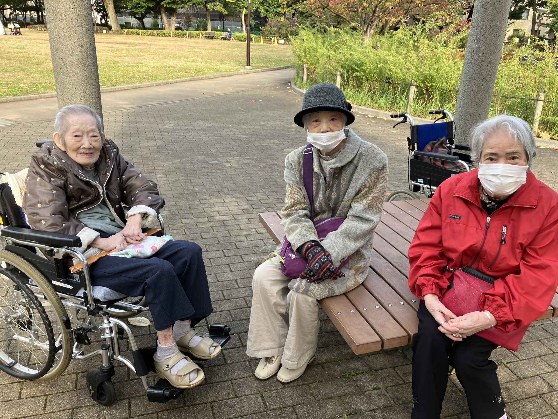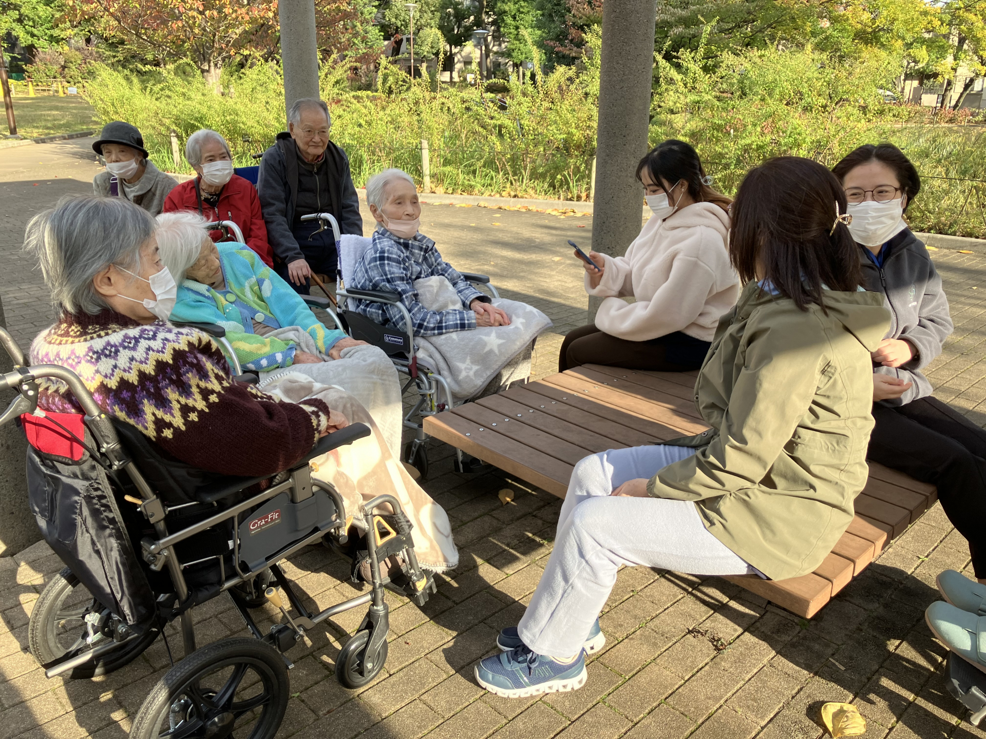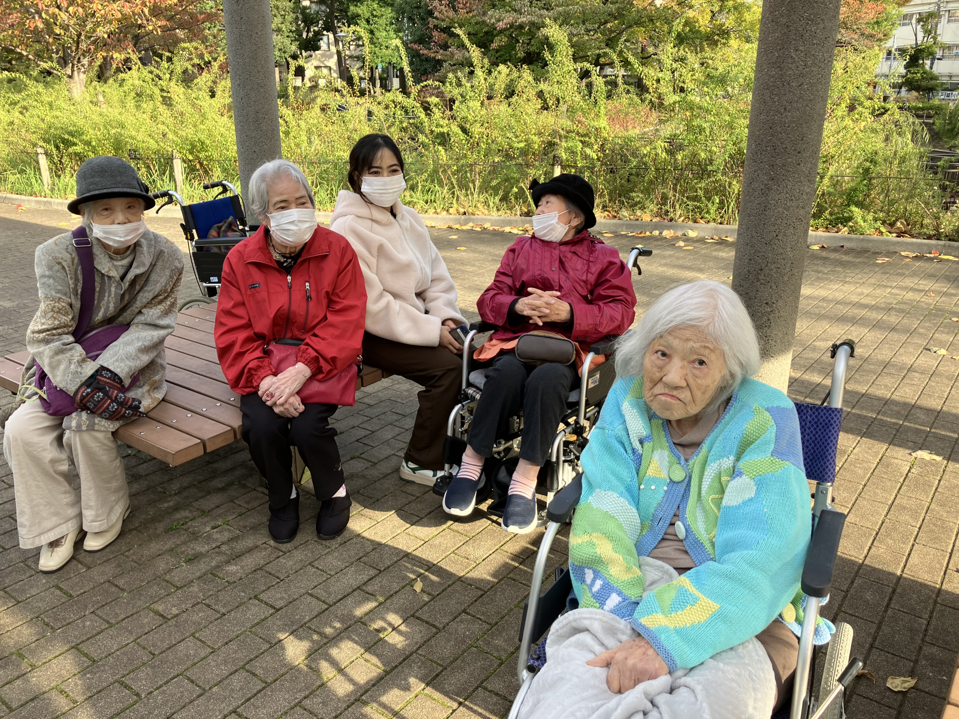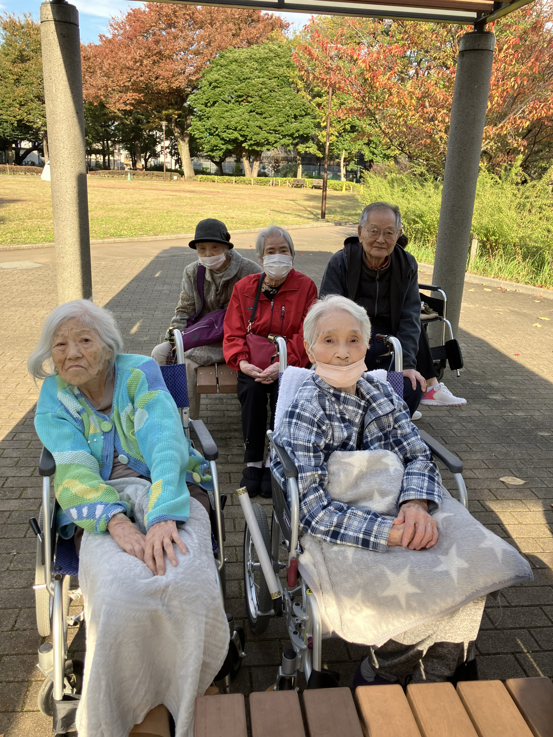 みなさん、集まって紅葉を見ながら、ひなたぼっこをしたり