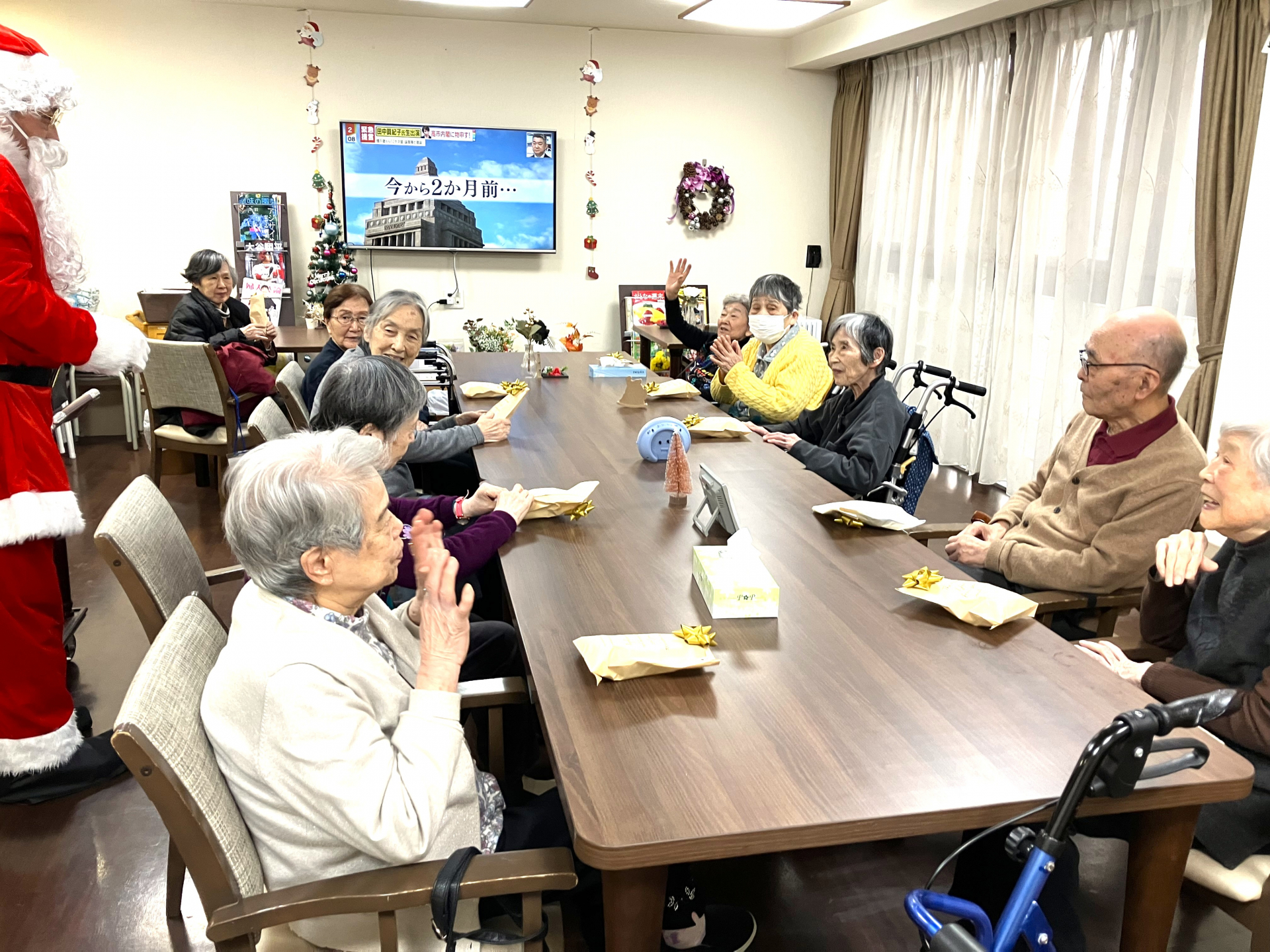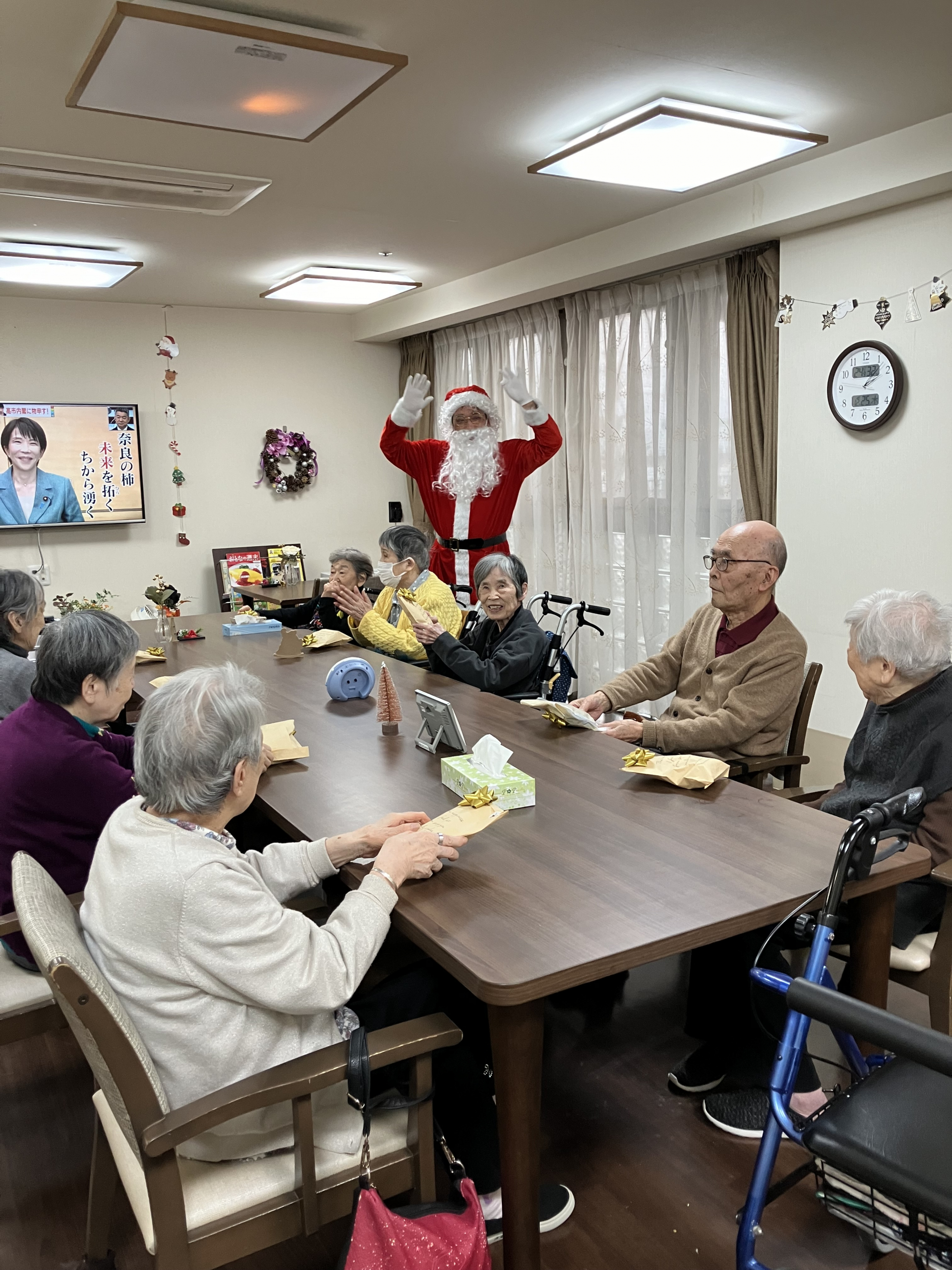 「みんなにプレゼントは渡ったかな~」サンタさんの掛け声にプレゼントをあげてお応えされていました