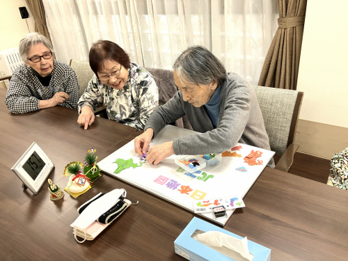 2人で苦戦をしていたら、近くで帰り自宅して出口に座ってた利用者様も帰りたかったことを忘れてパズルに参戦