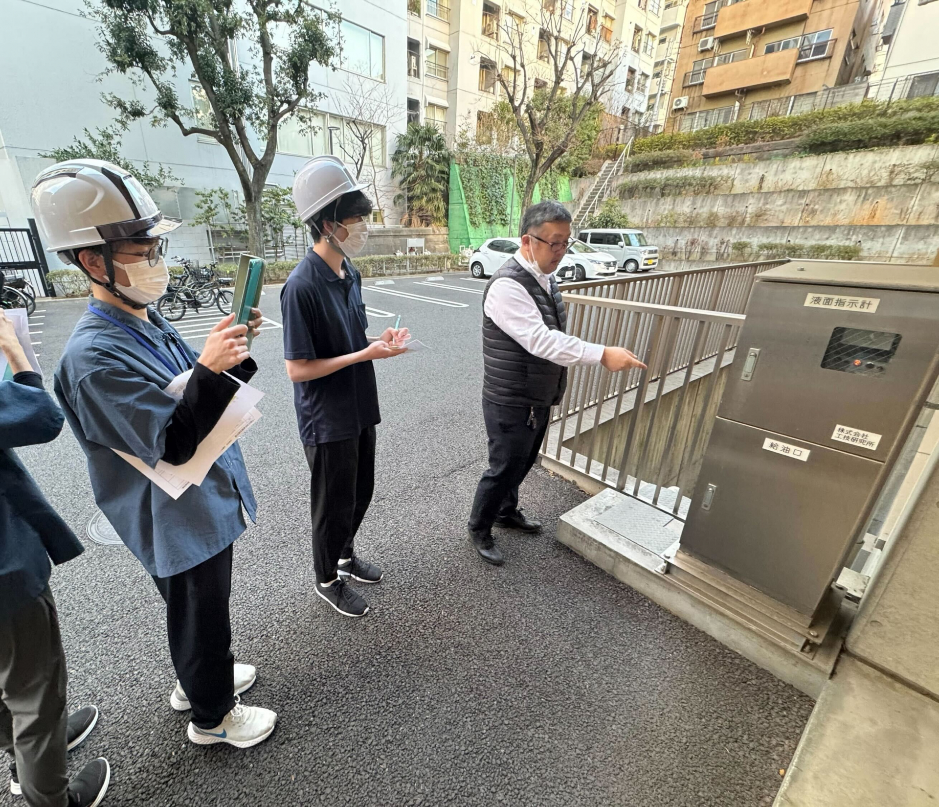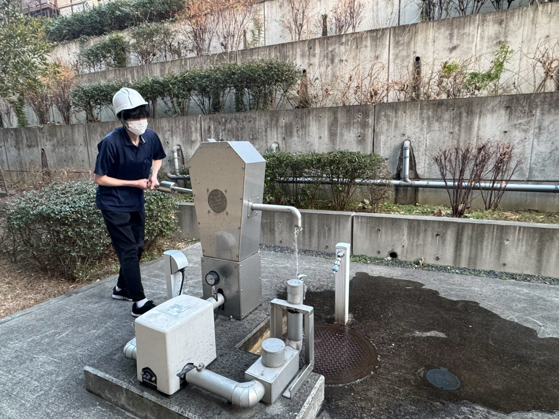 次に、外に出て、つばめの里の施設の裏に設置された井戸の体験をしました!井戸も非常に軽かったため、女性職員でも簡単に水を出すことができます!また、つばめの里の非常発電について説明を受け、停電しても3日間は施設全体の電力を賄えることができるんです!!