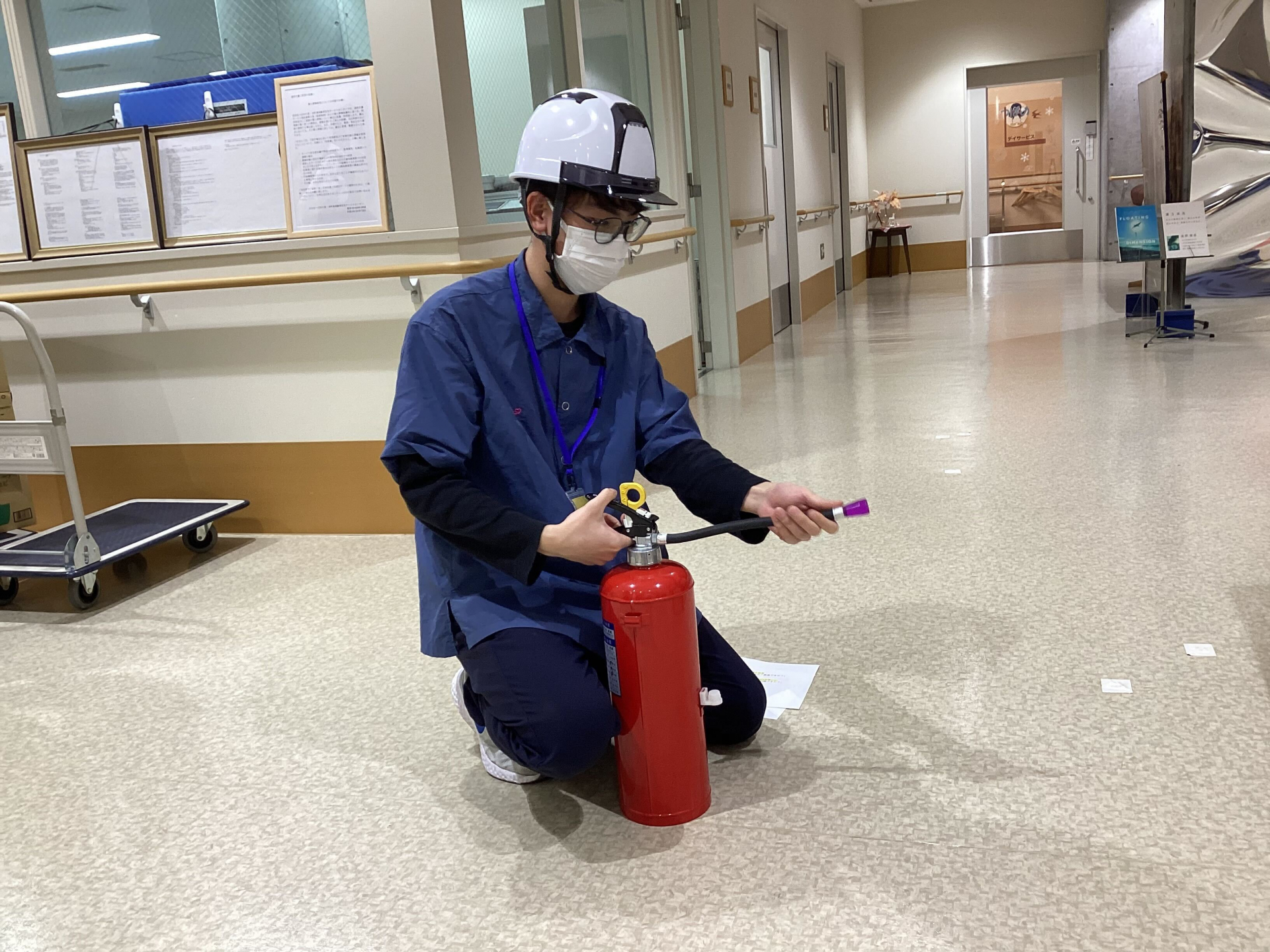 また、つばめの里のユニットやフロアには消火栓や消火器が設置されており、その正しい使い方を実際に練習いたしました!