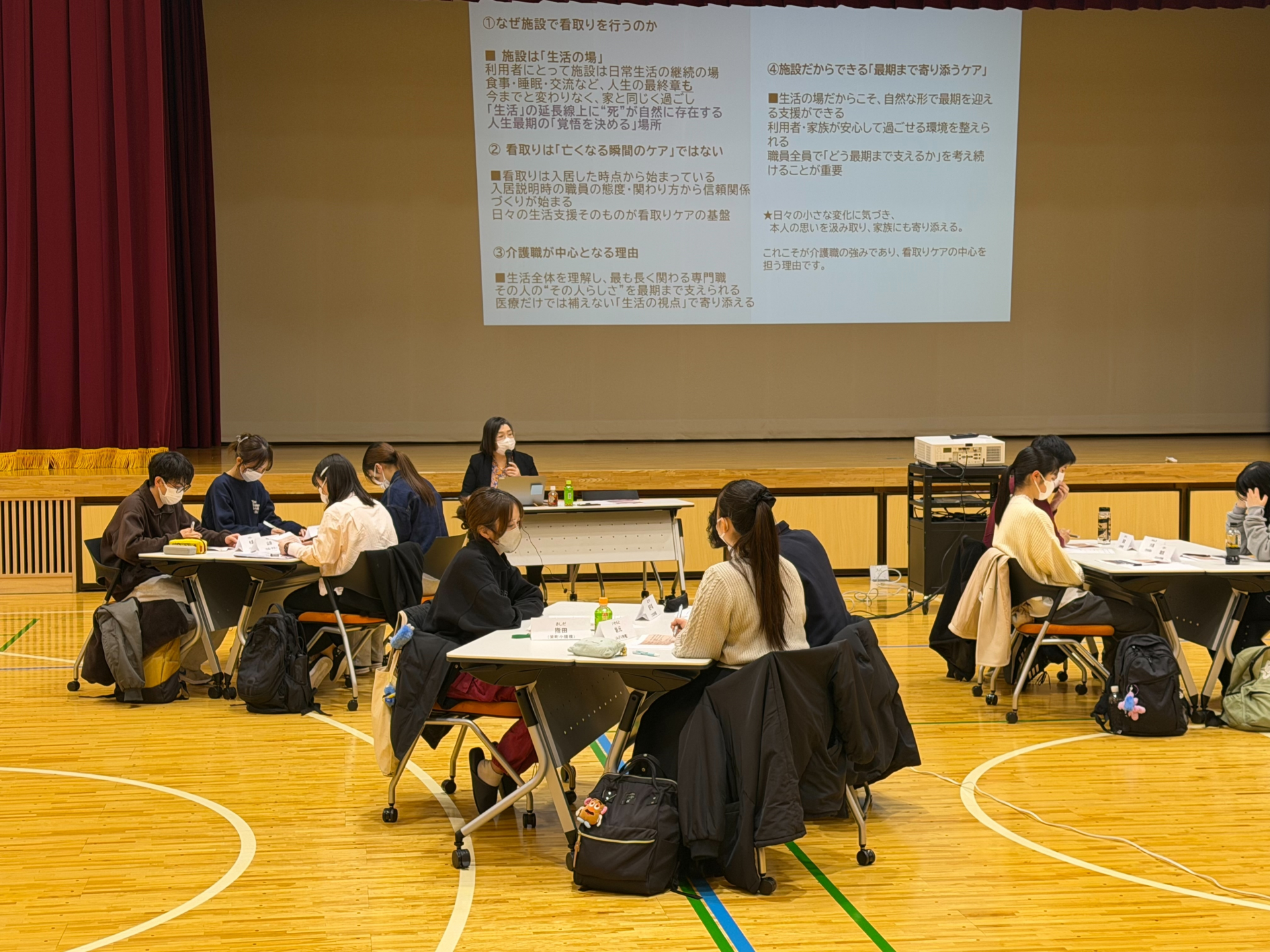 講師は、つばめの里 看護課の圓谷課長が担当しました。現場での経験を交えながら、分かりやすく丁寧にお話しいただき、参加者も真剣な表情で耳を傾けていました。圓谷課長も大活躍の研修となりました。