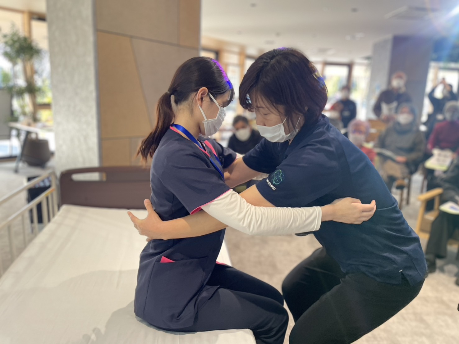 世田谷区と連携した「介護者教室」に参加し、介護技術を学びながら地域とのつながりを実感。
