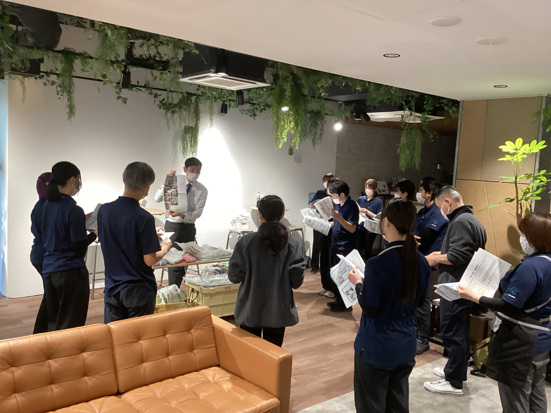 今回は弦巻の家で使用させていただいているおむつ業者さんの、カミ商事の木下さんにおむつの当て方の講義を依頼させていただき、未経験の職員も経験のある職員も総勢15名に参加していただくことができました。