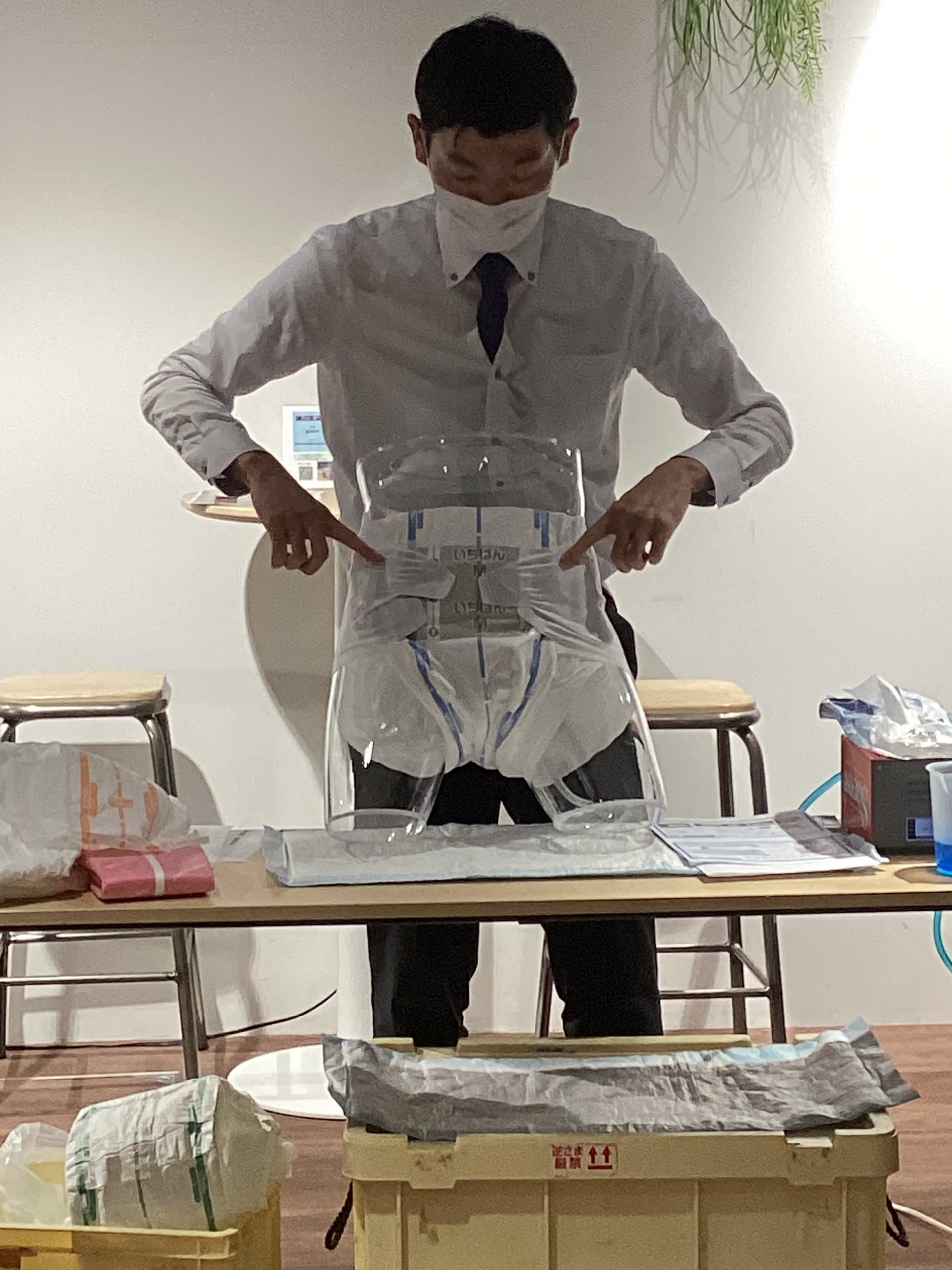体型に合わせたおむつのサイズの選択、尿量に対してのパットの使い分け、フィットさせるための当て方のポイント、実際の排尿時はどのようにパット吸収しているのか、模型を使用して分かりやすい講義でした。