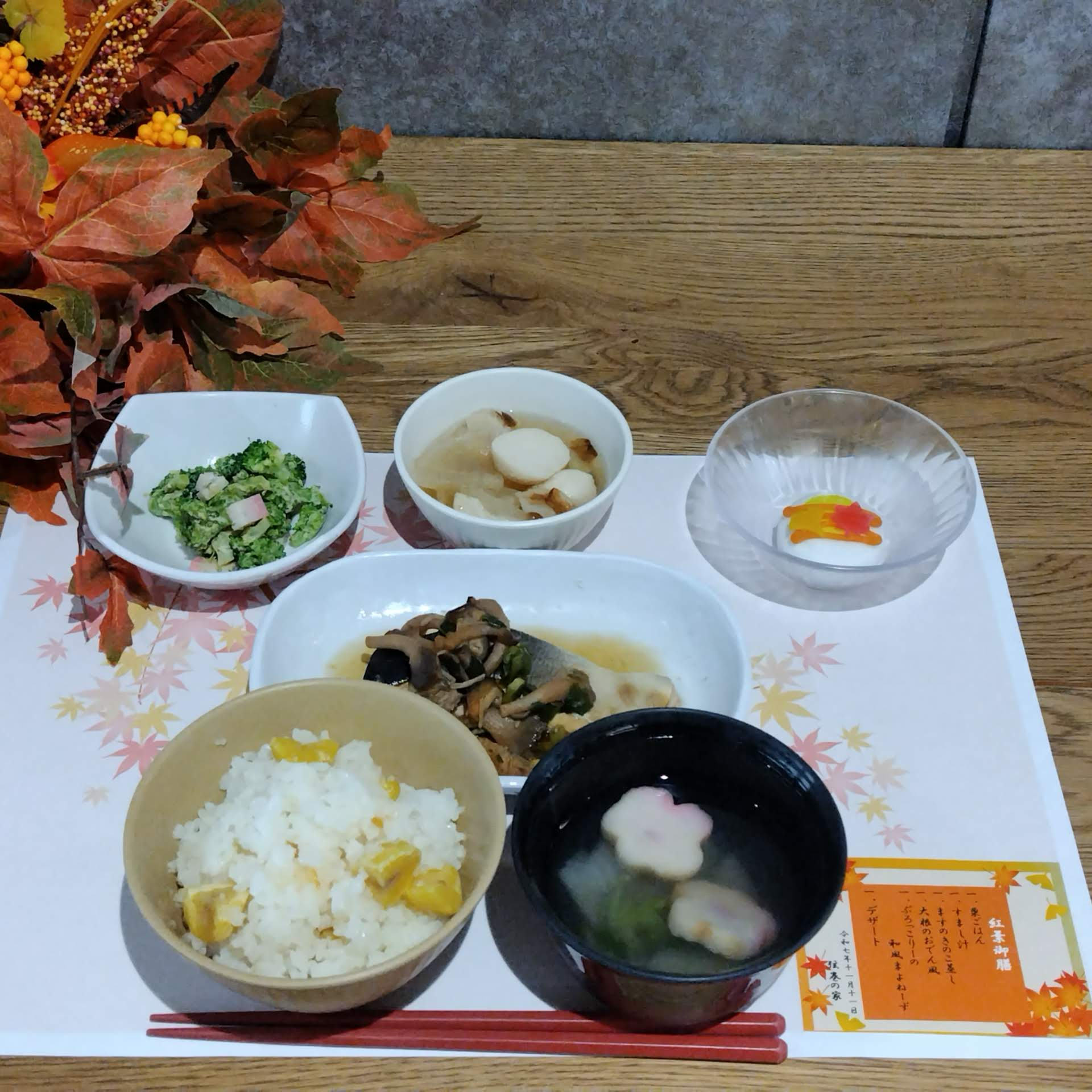 テーブルに並んだお膳は、秋の香りと彩りでとても華やか。利用者様からも「きれいね」「季節を感じるね」と笑顔が広がっていました。