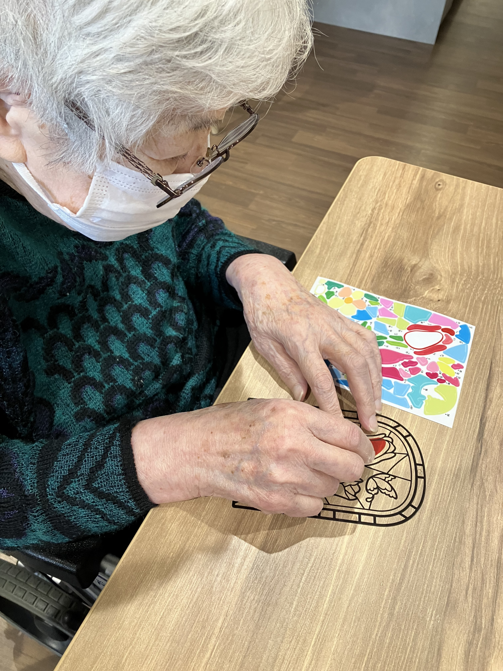 最近100円ショップで見つけた「ステンドグラス風の塗り絵シール」を見せると、「やってみようかしら」と朝から細やかな作業に挑戦!!