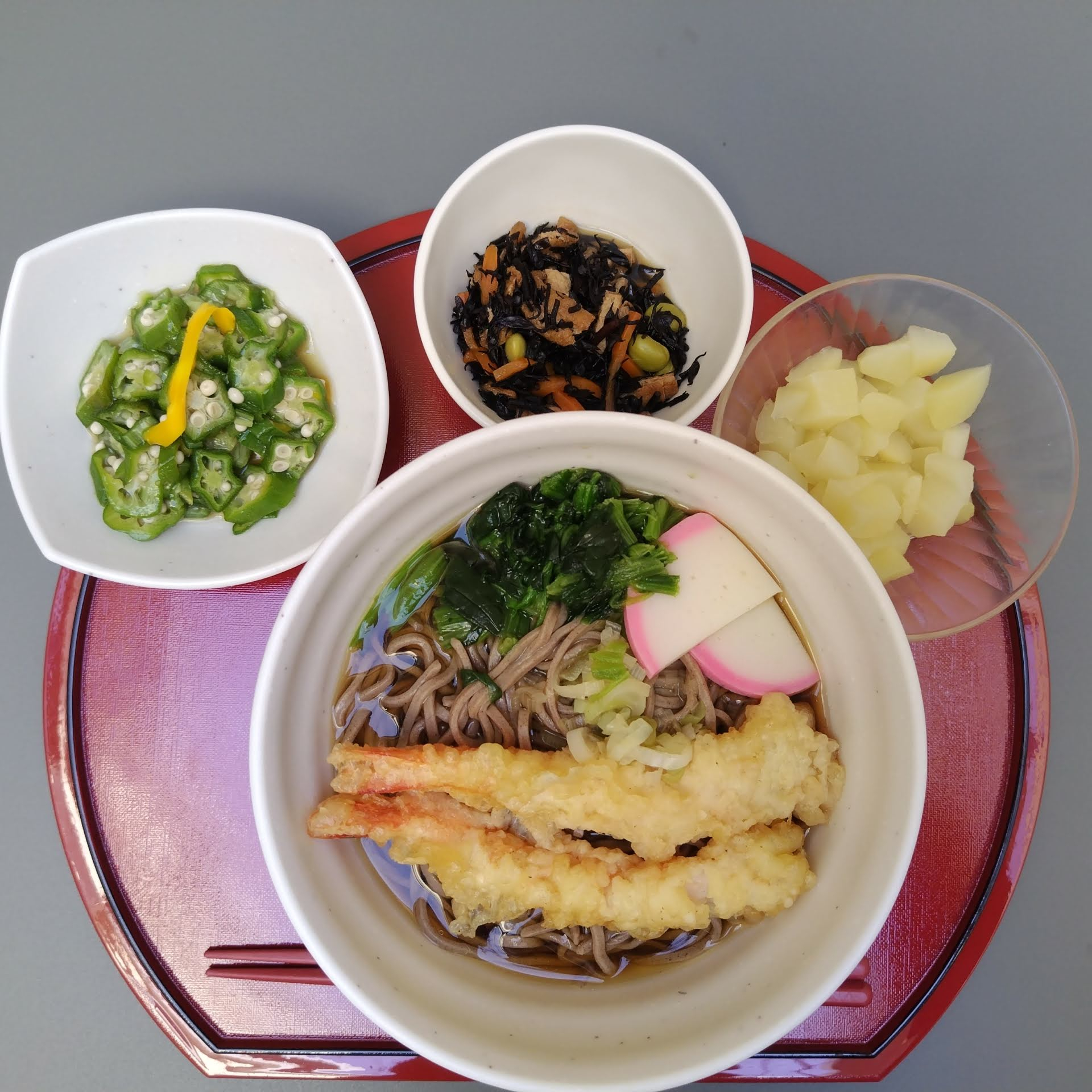 本日、ショートステイでは大晦日の恒例行事、「年越しそば」をご提供いたしました。一年の締めくくりにふさわしい、ボリュームたっぷりの献立です。