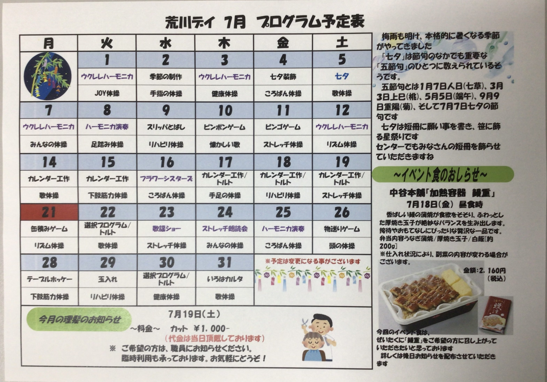 荒川東部サービスセンターの今月の『プログラム予定表』と