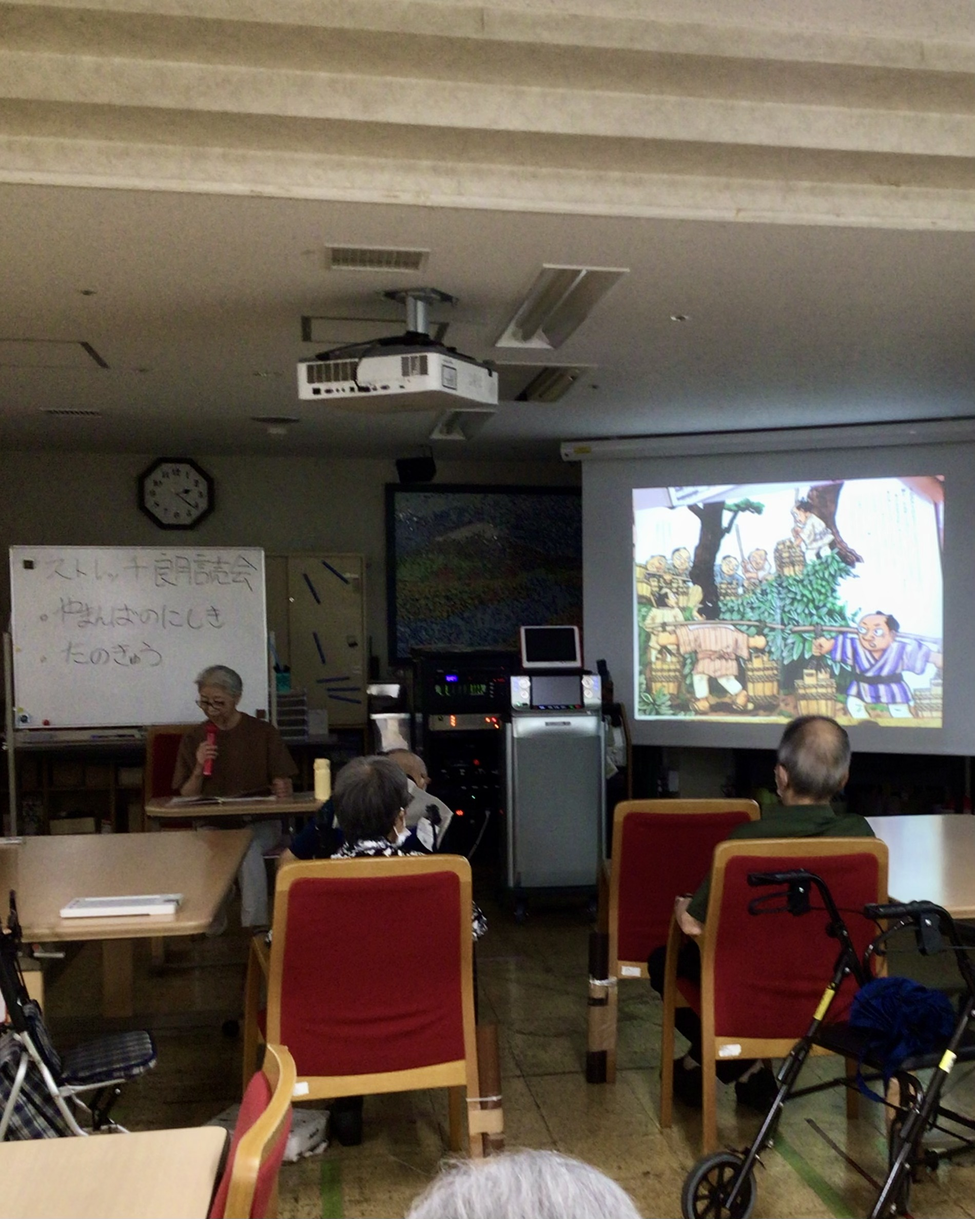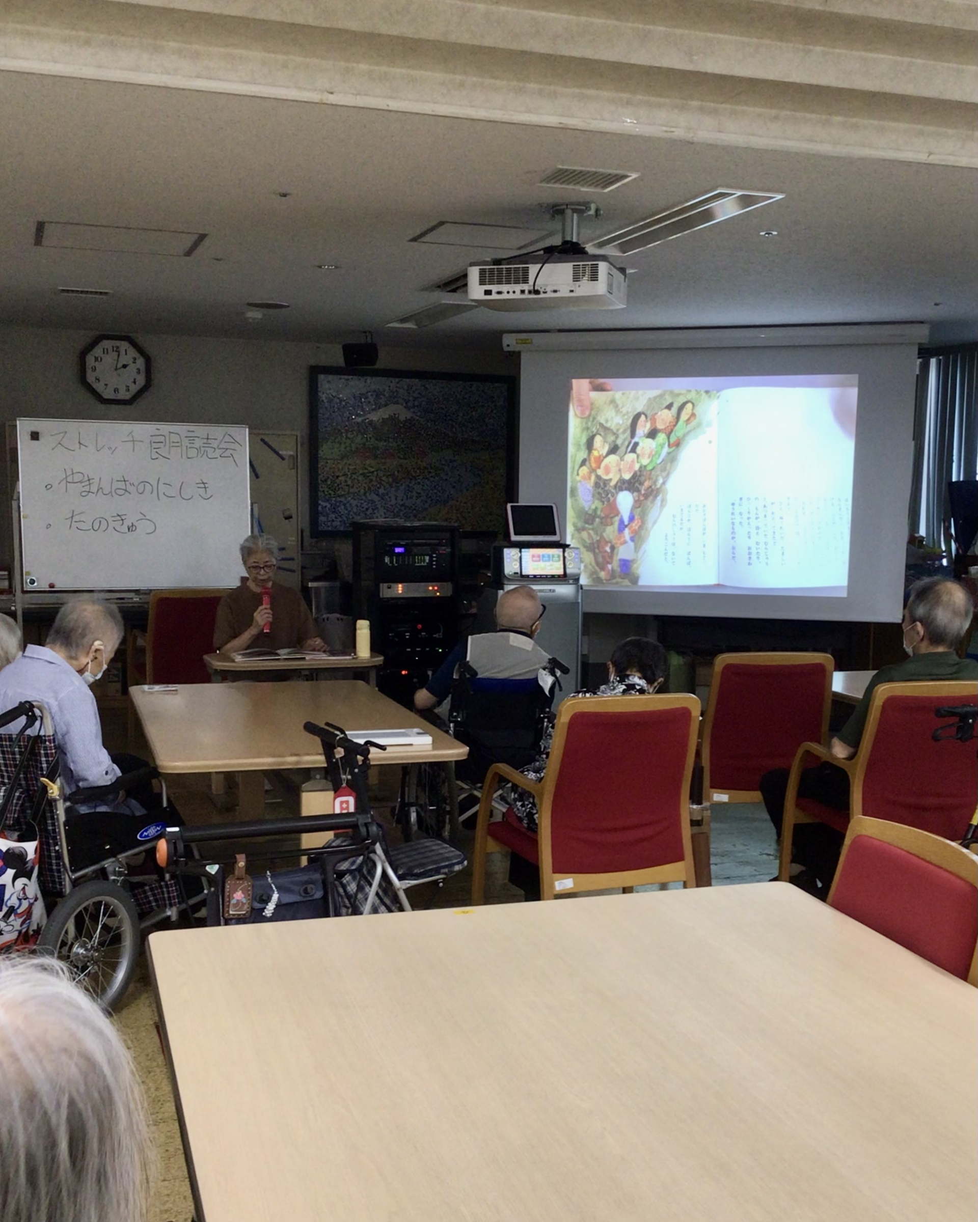 本日の午後のプログラムは田谷先生による「ストレッチ朗読会」でした。「やまんばのにしき」から始まり・・・
