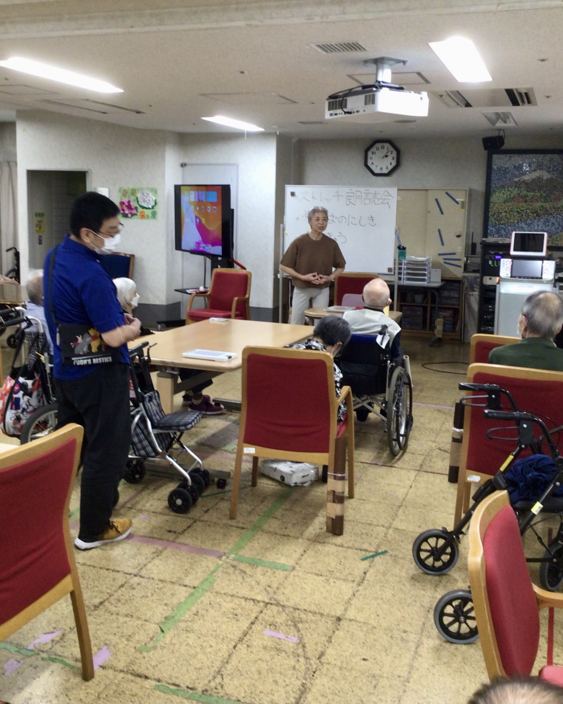 様々な声色や口調を巧みに発声される朗読に、皆様楽しそうなご様子でした。刺激を受けるだけでなく、お身体を動かしたり、歌による発声等、身体にも良い時間でした。田谷先生、ありがとうございました。