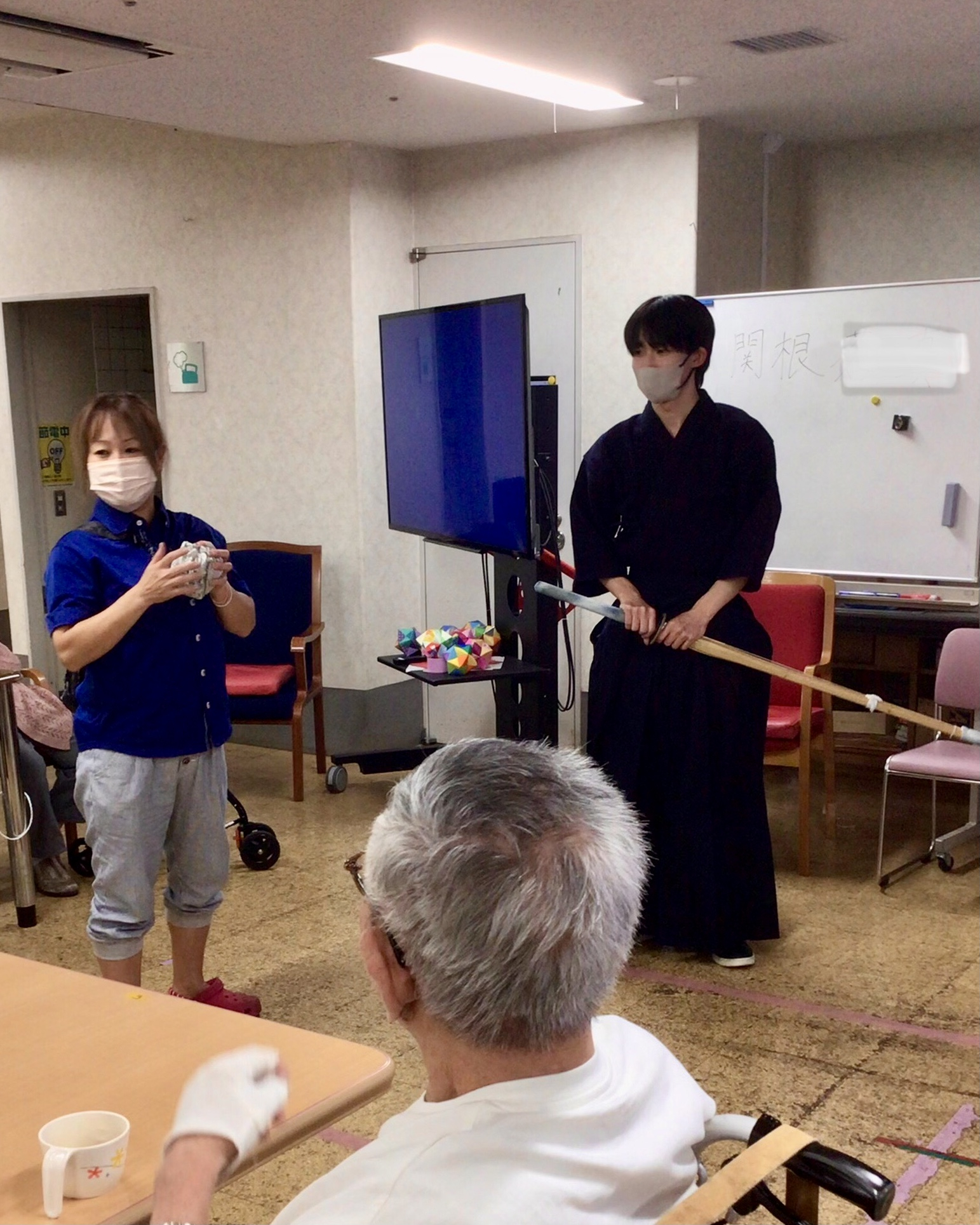 今週も実習の学生さんがいらっしゃいました。子供の頃から剣道をされている関根さん、最後の本日、皆様にその腕前を披露してくださいました。