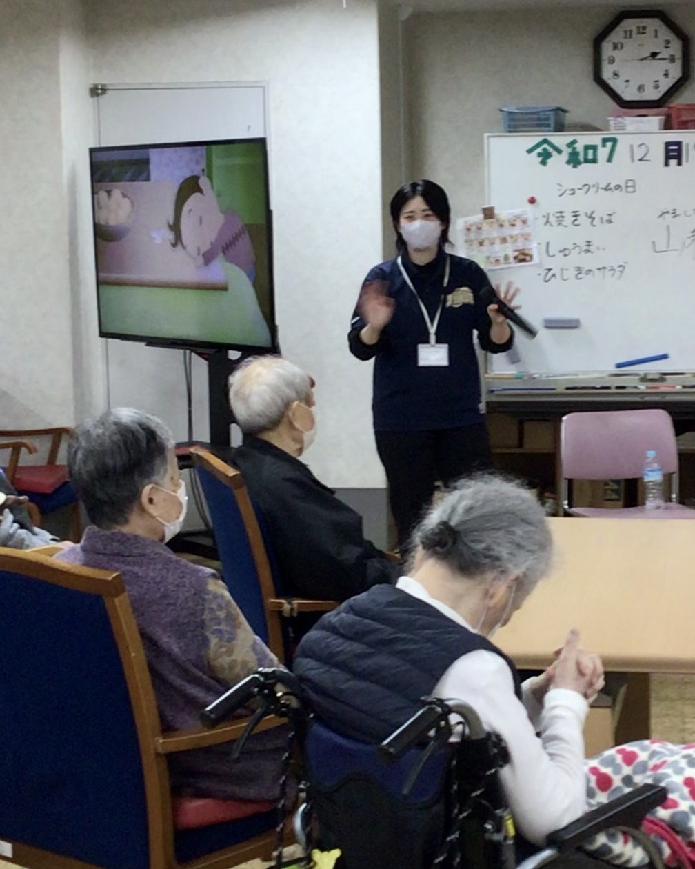 山口百恵さんの「プレイバックPART2」やスタジオジブリの曲など5曲を熱唱。とてもお上手で、皆様大変喜ばれていました。ある利用者様は「若い人のエネルギーをもらったわ!」と笑顔でおっしゃっていました。