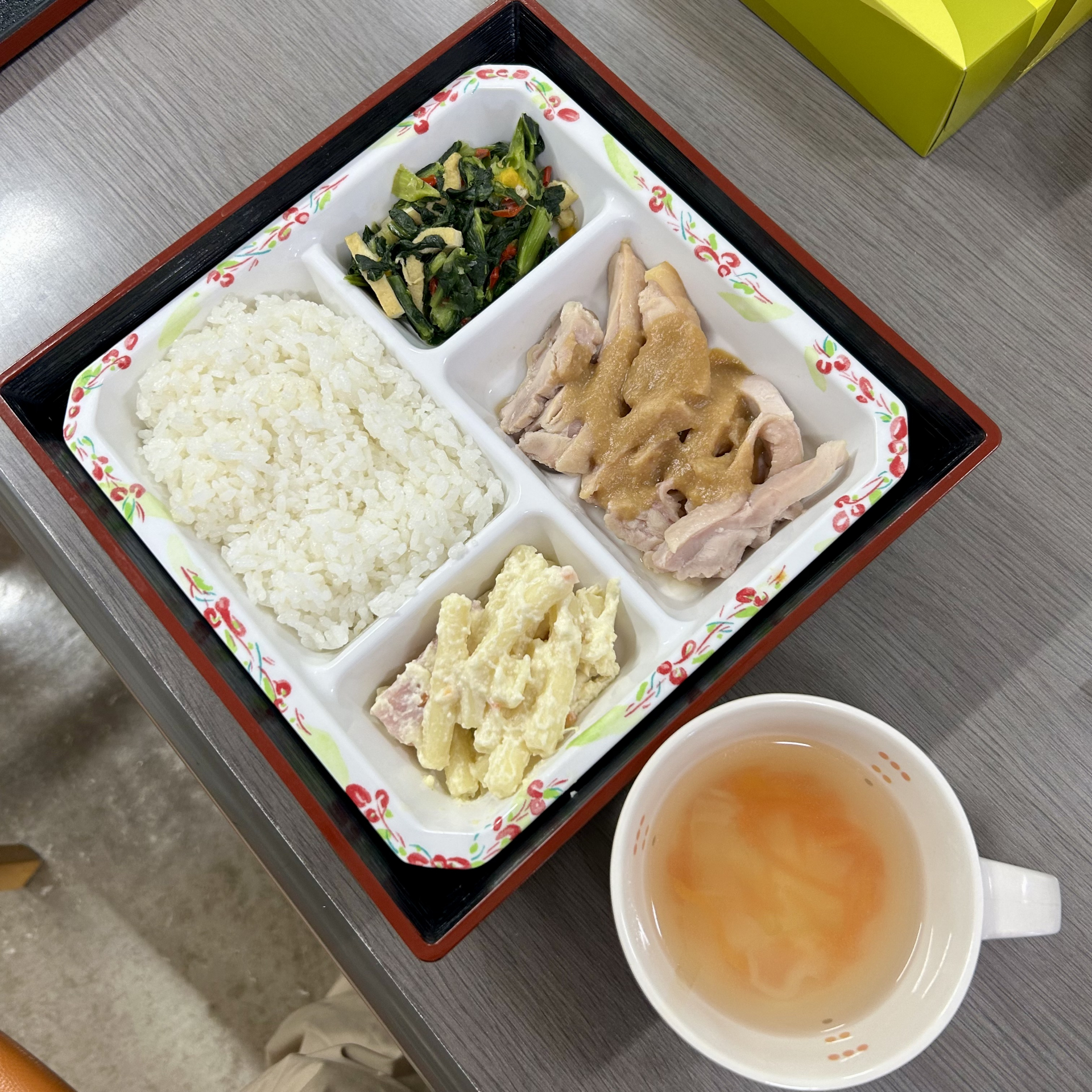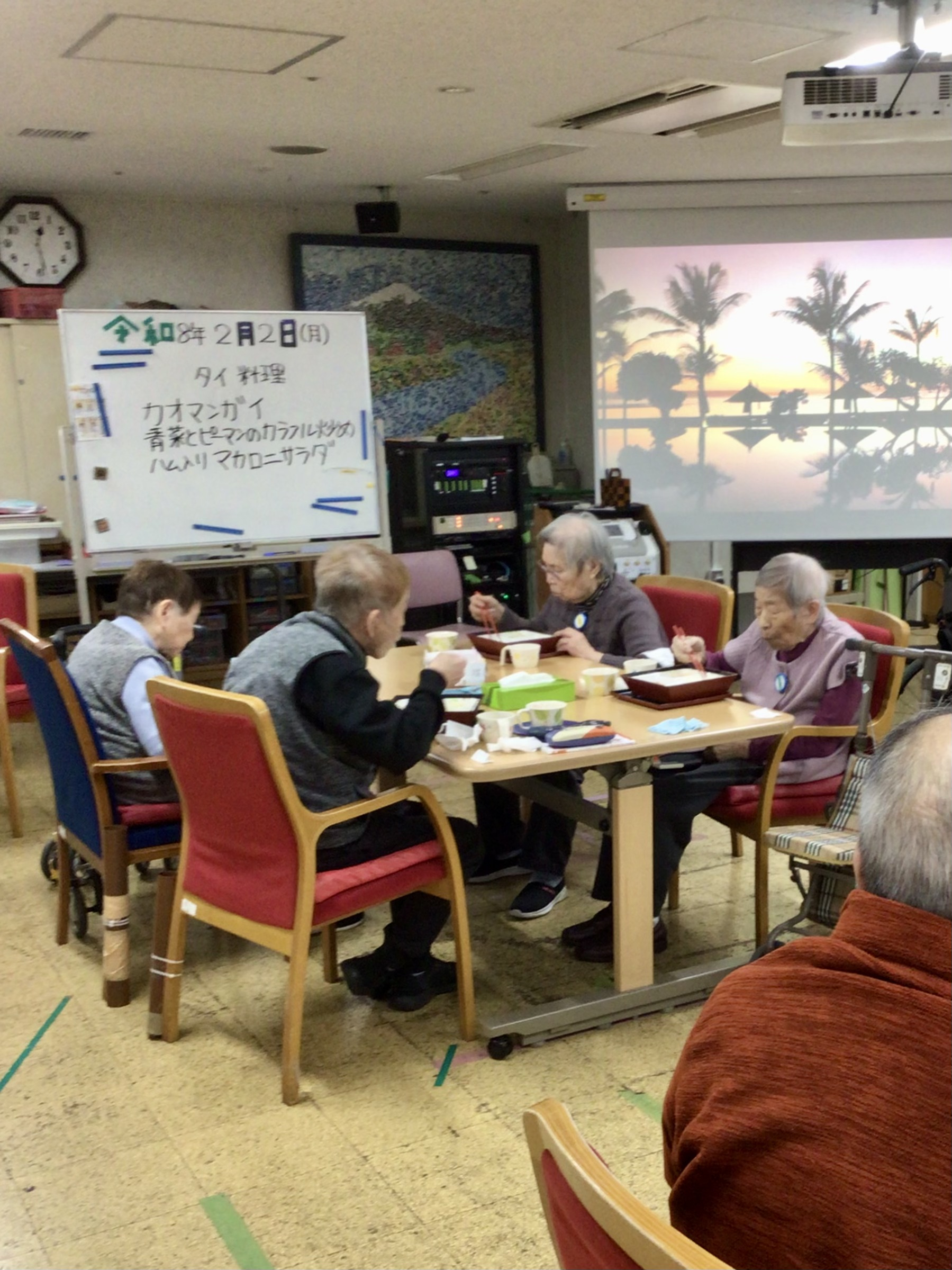 「カオマンガイ」はタイのチキンライスですね。甘塩っぱいタレをかけていただきます。BGMはタイの伝統音楽(ガムラン等)を流し、束の間ですが、タイ旅行気分をお楽しみいただきました。