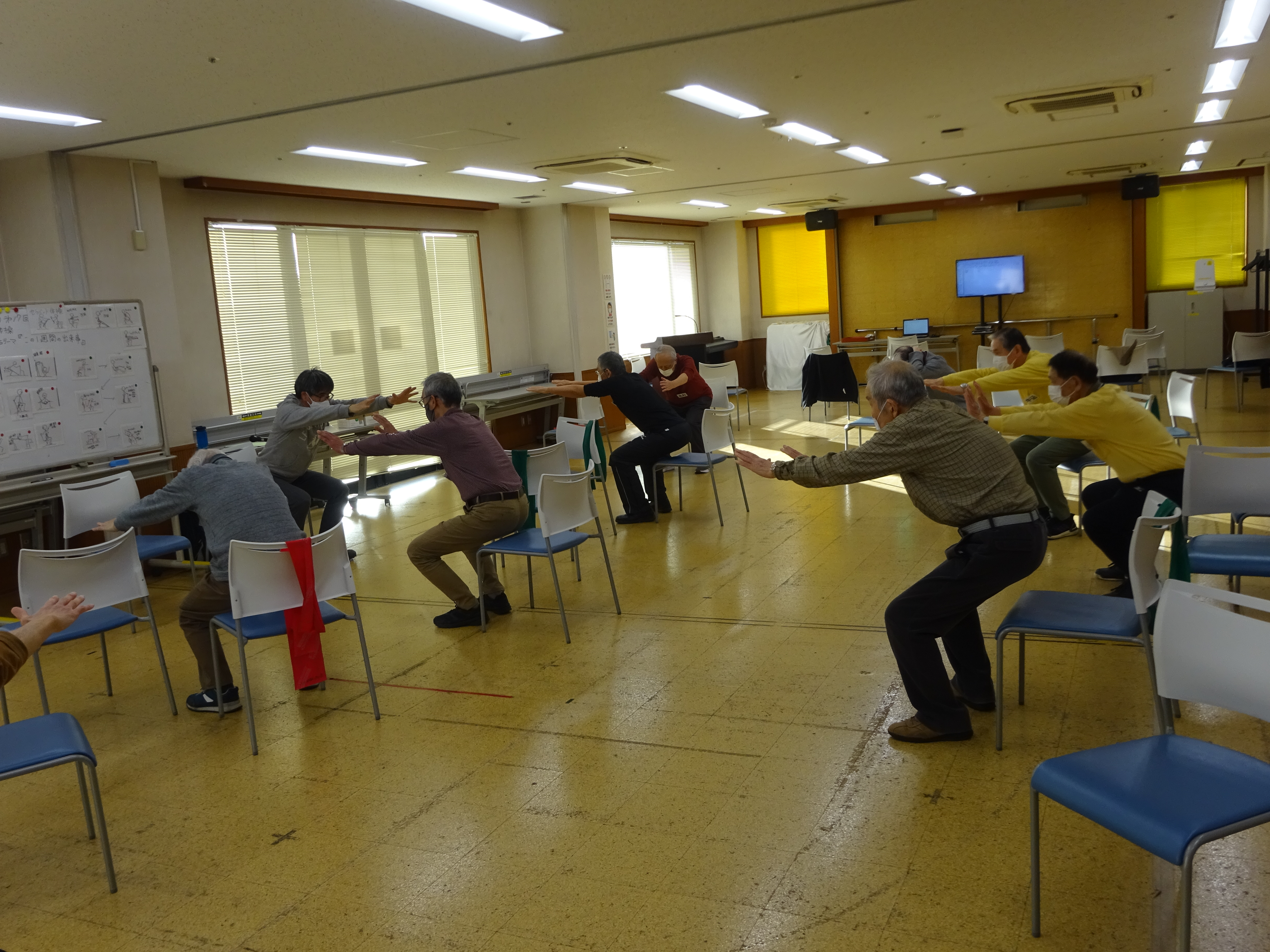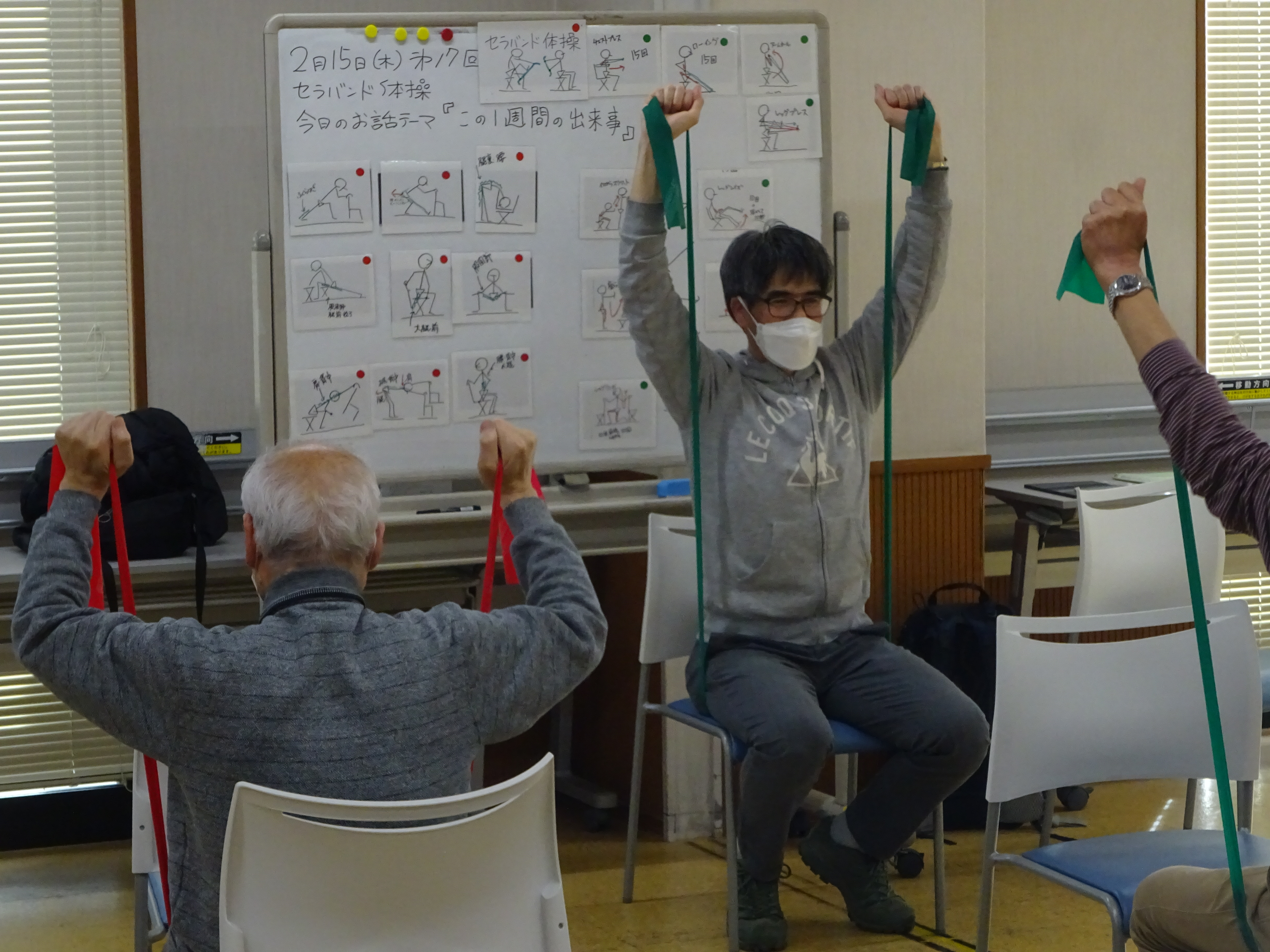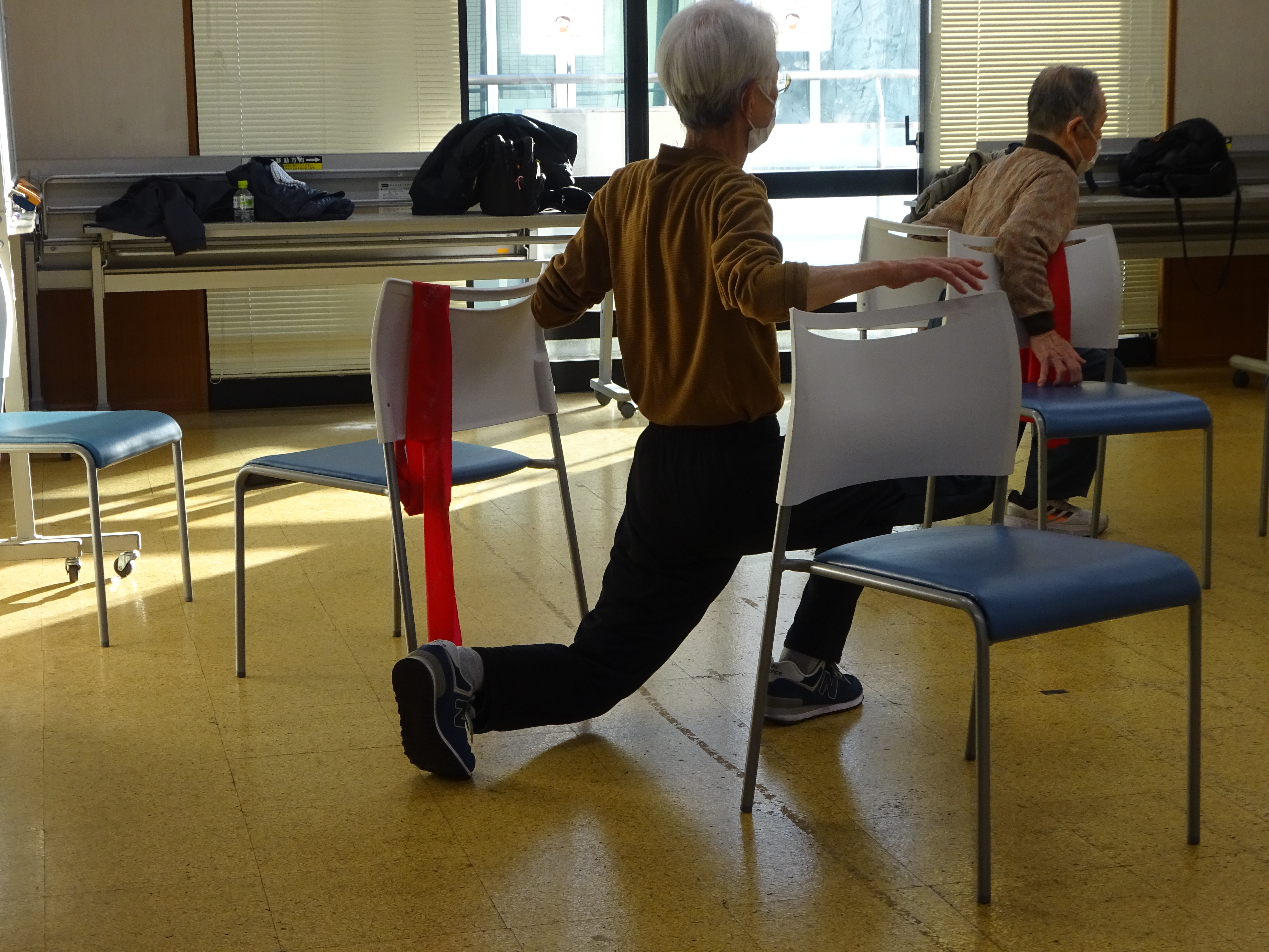 ストレッチ、筋力トレーニングなどセラバンドやいすを利用していろいろな体操を行っています