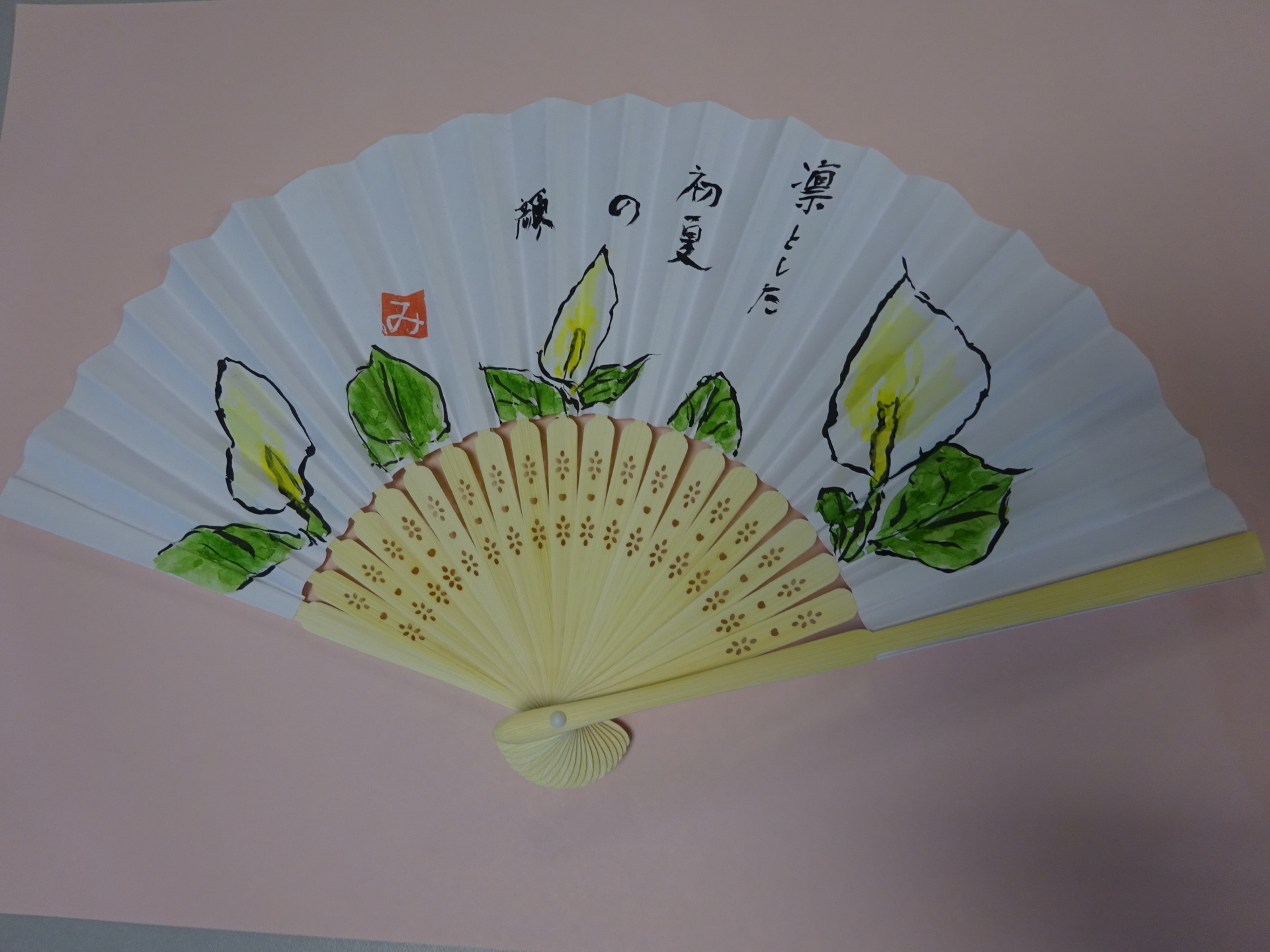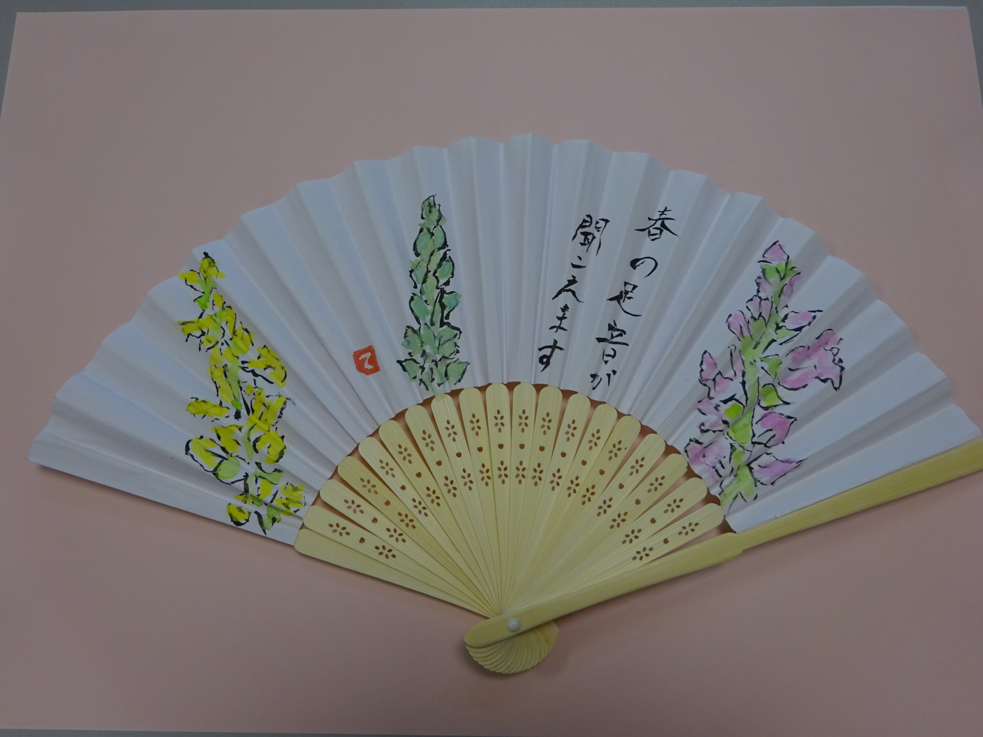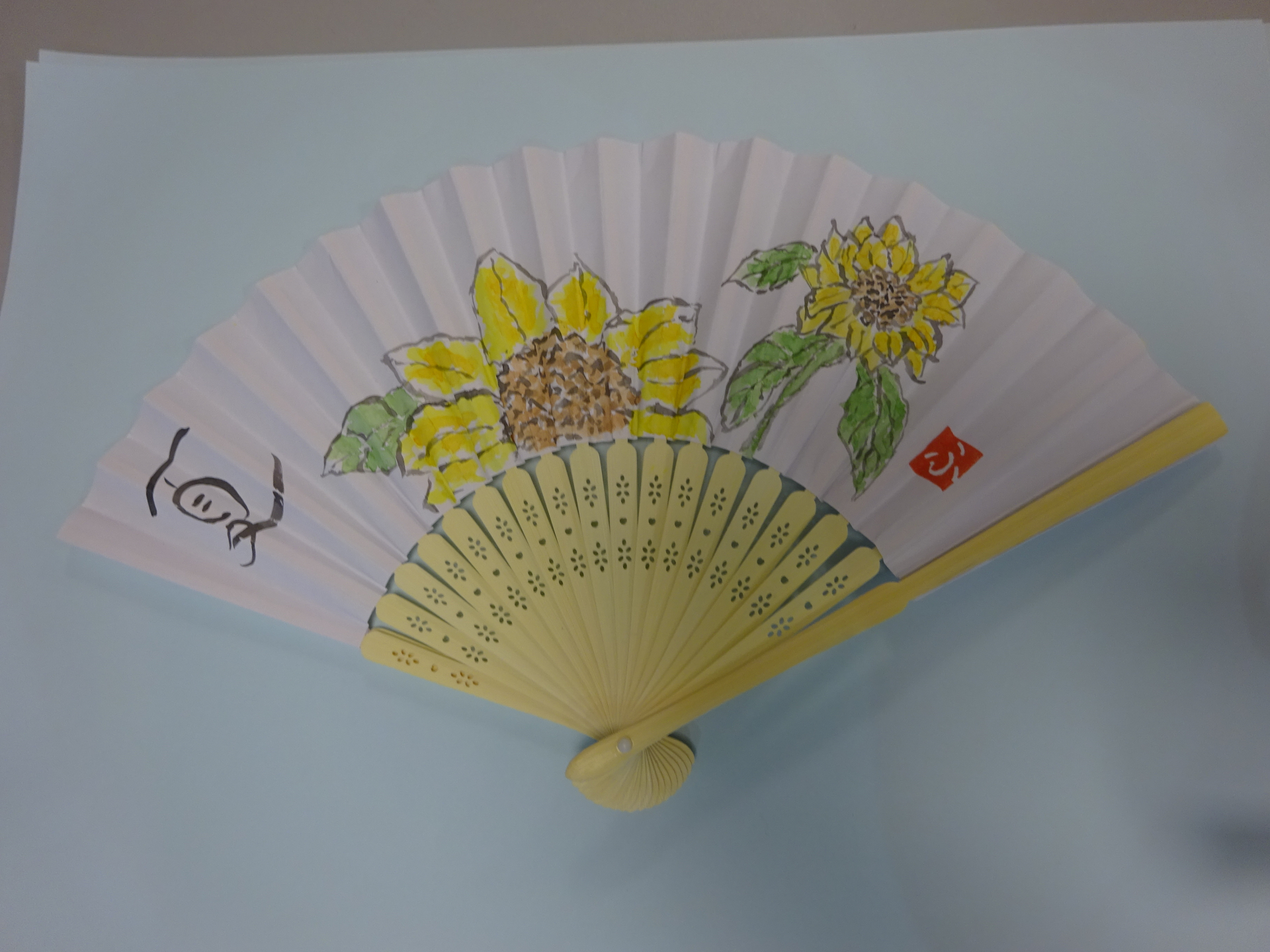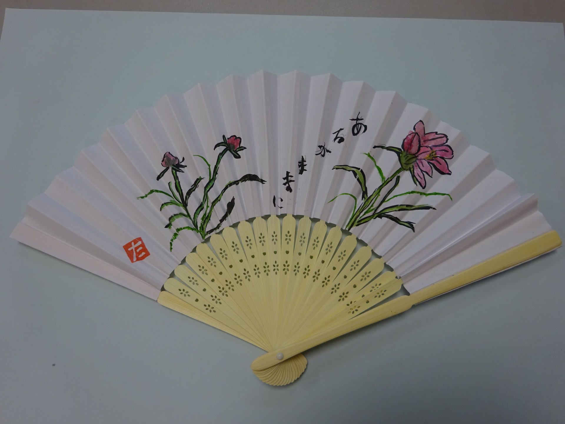 描く素材は扇子です。扇型のデコボコした紙に下絵を筆で書き入れ、色の染料を塗っていく工程です。