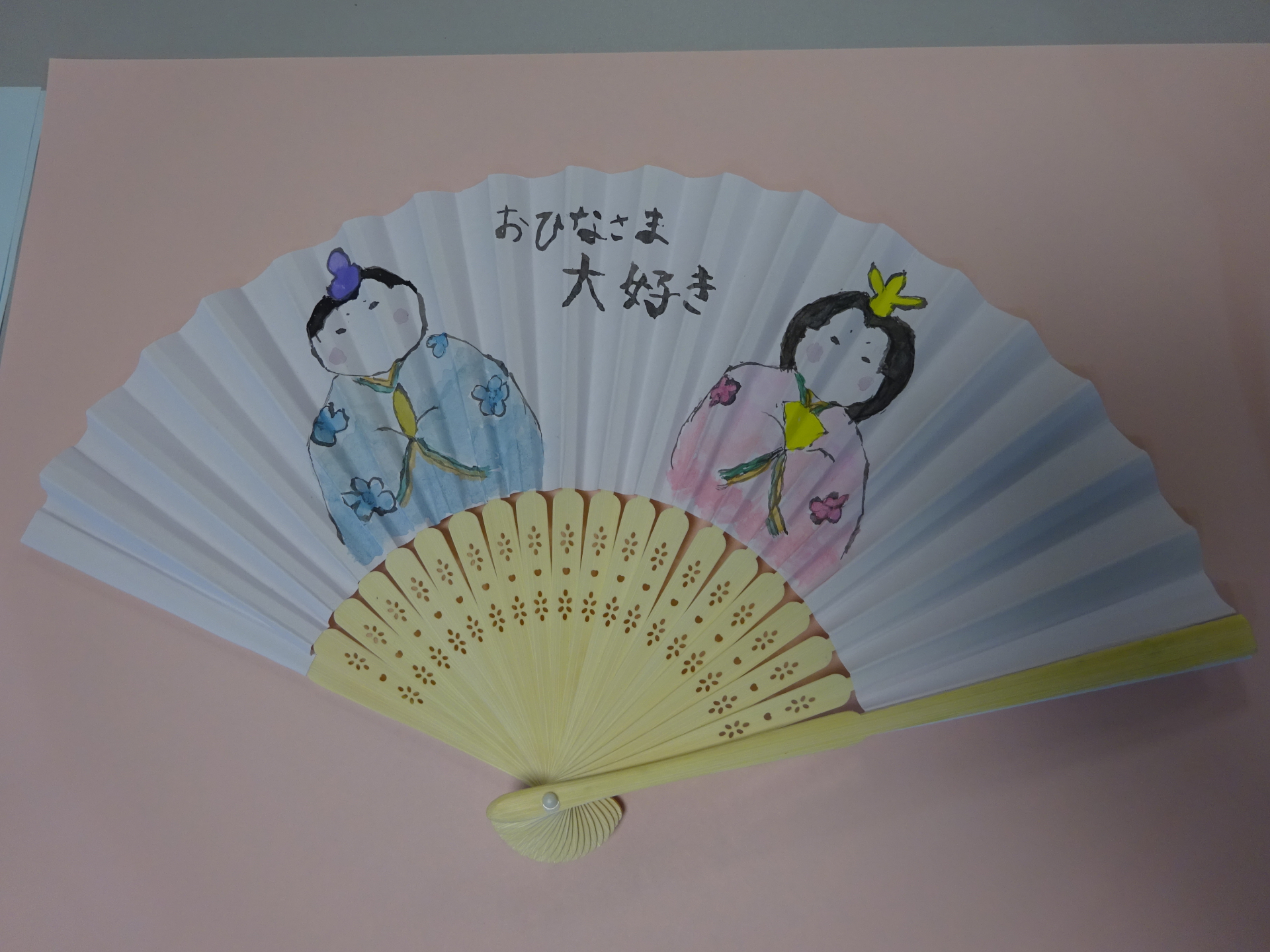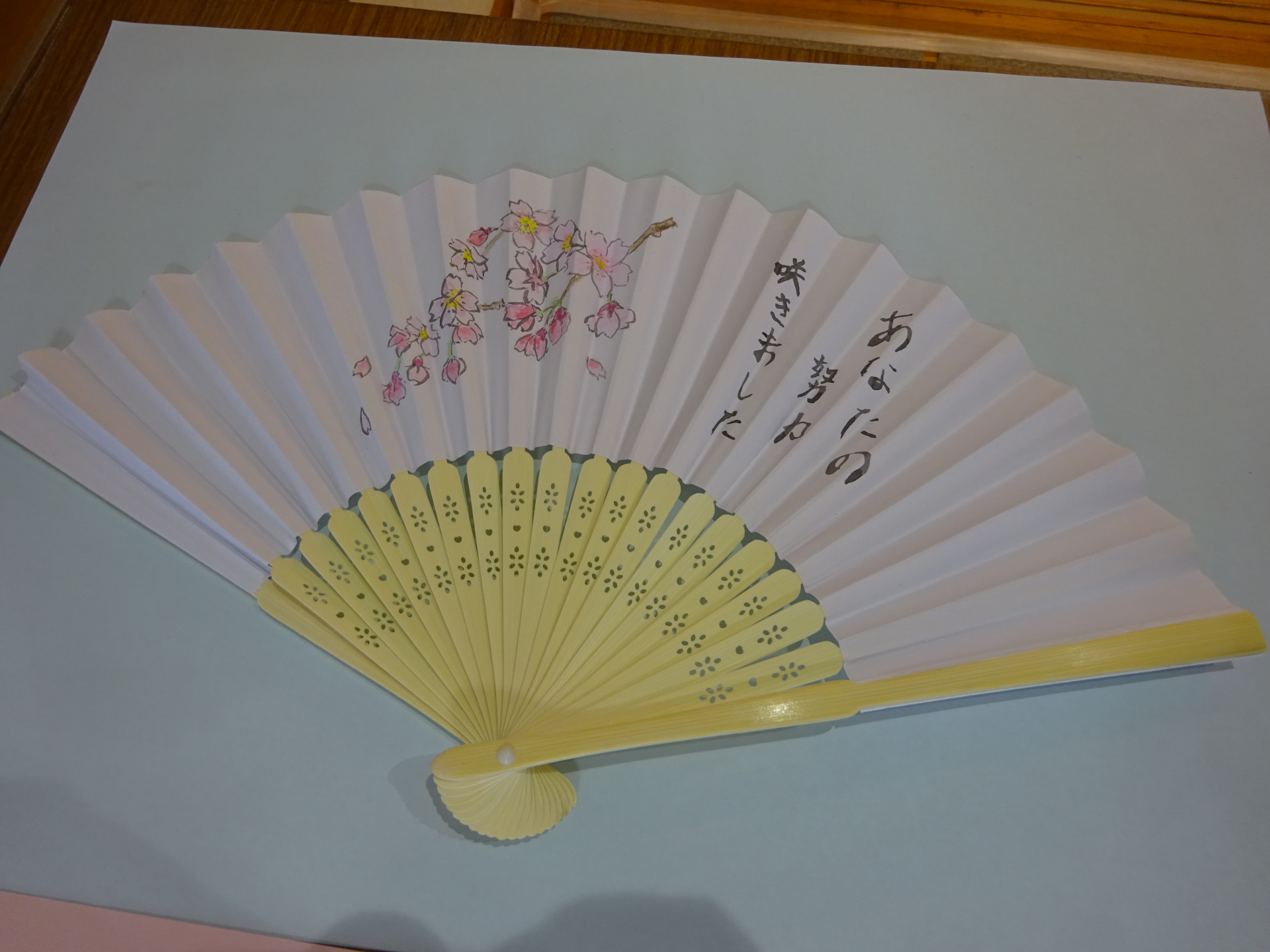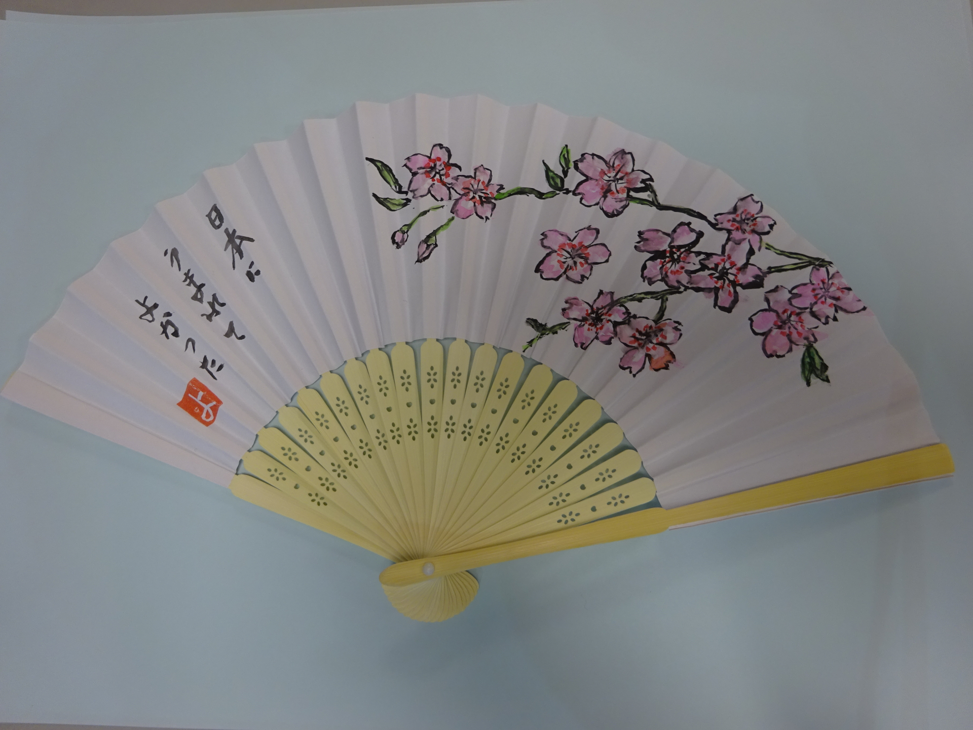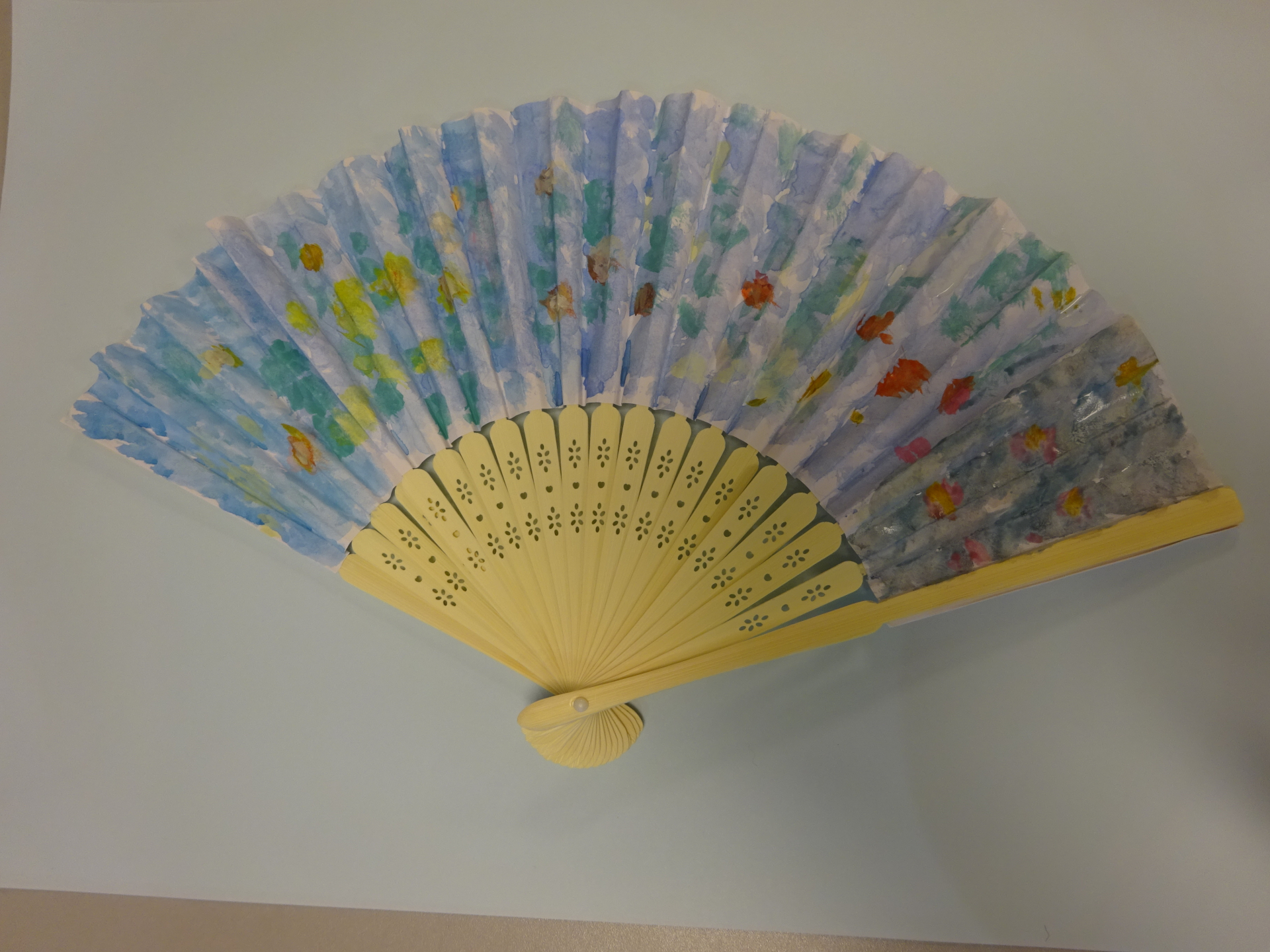 描く素材は扇子です。扇型のデコボコした紙に下絵を筆で書き入れ、色の染料を塗っていく工程です。