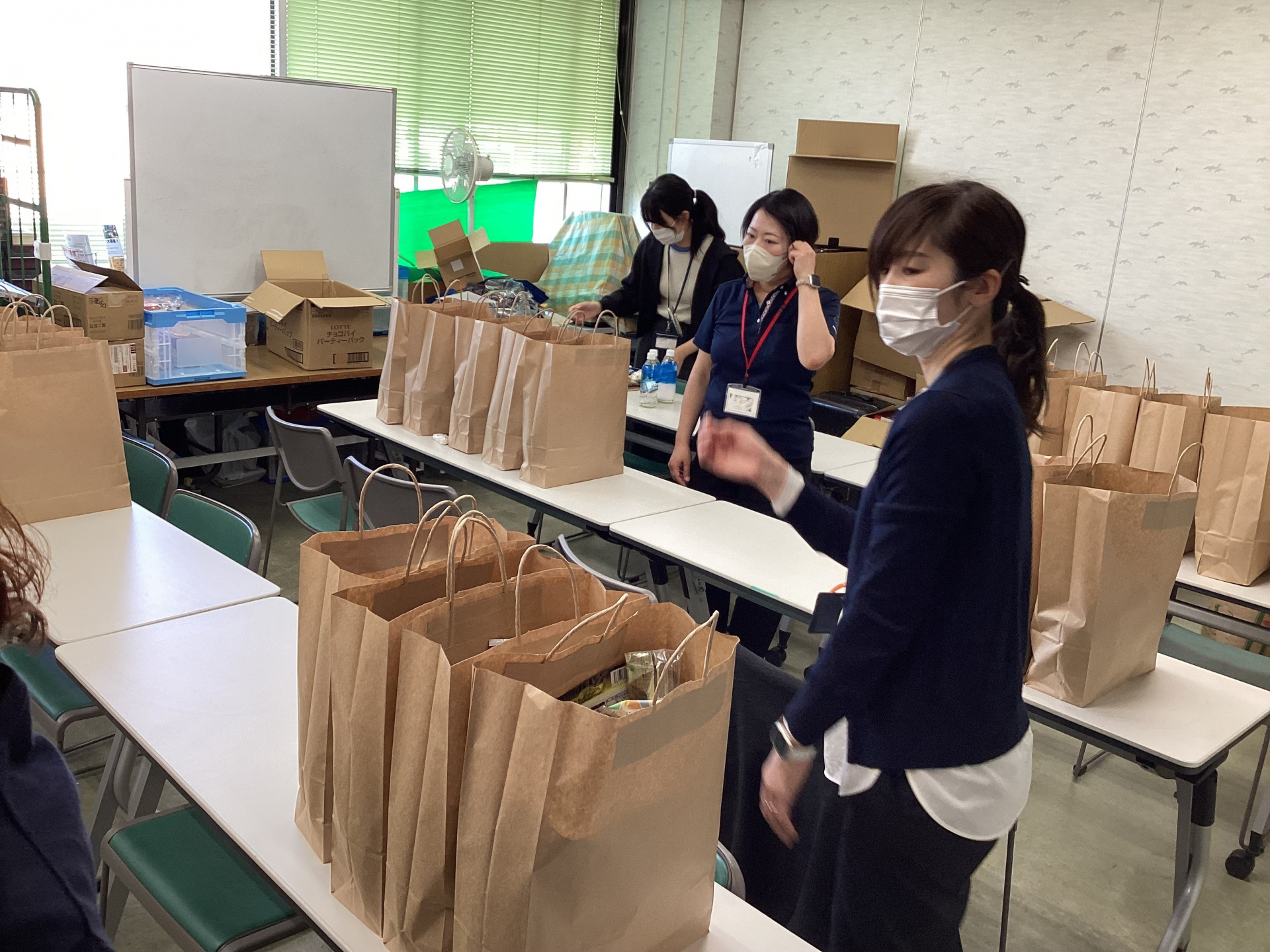 集まった物品を各世帯ごとに仕分けし、袋詰めをします。