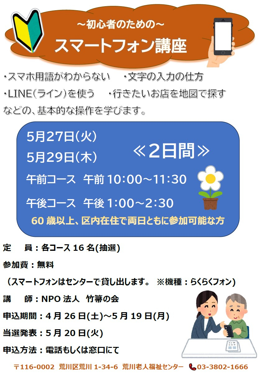 5月27日 火曜日 5月29日 木曜日の2日間で初心者のためのスマートフォン講座を開催します。