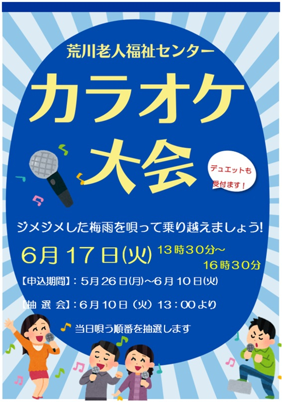 来週の6/17(火)、13:30よりカラオケ大会が開催されます‼