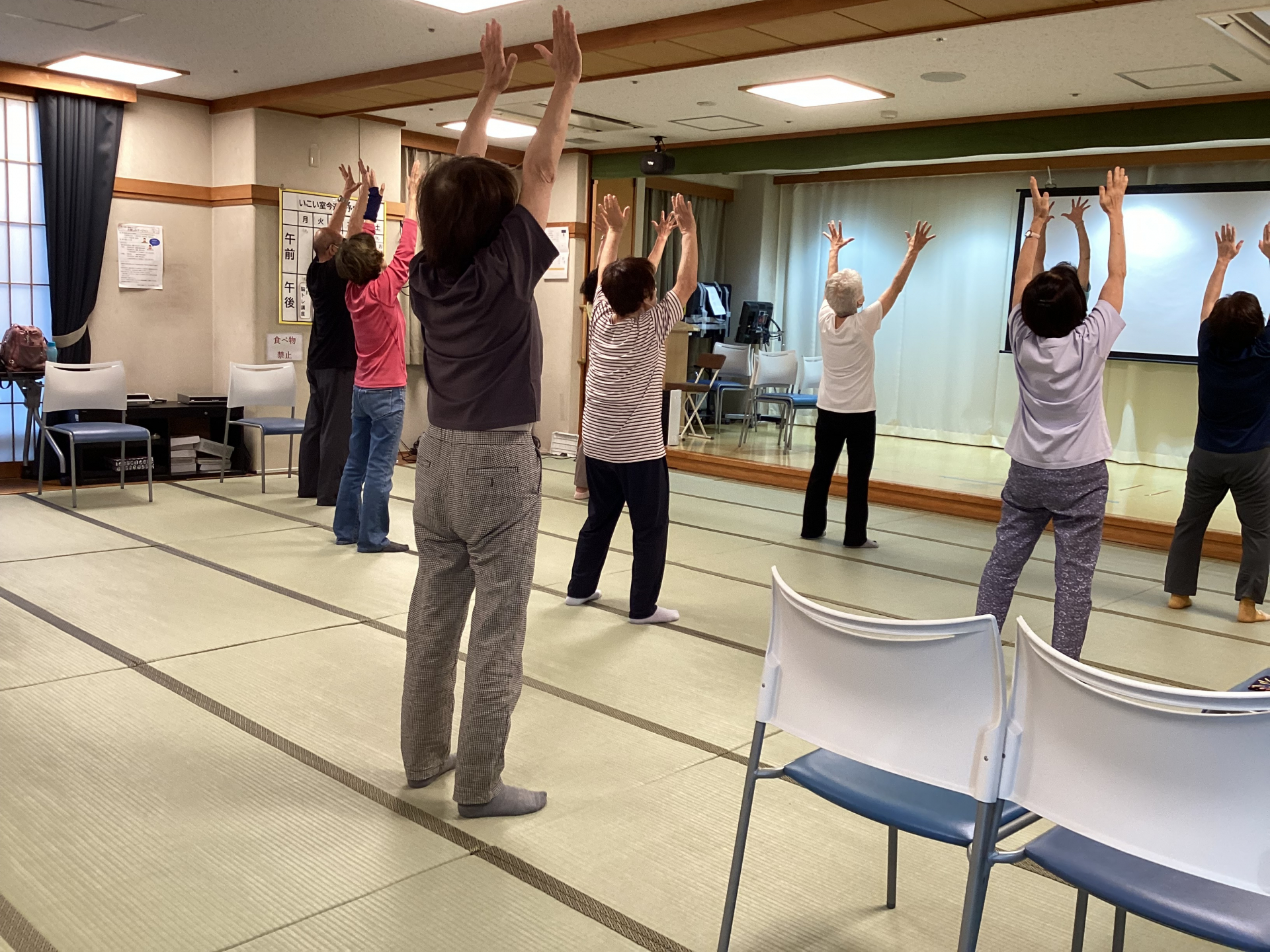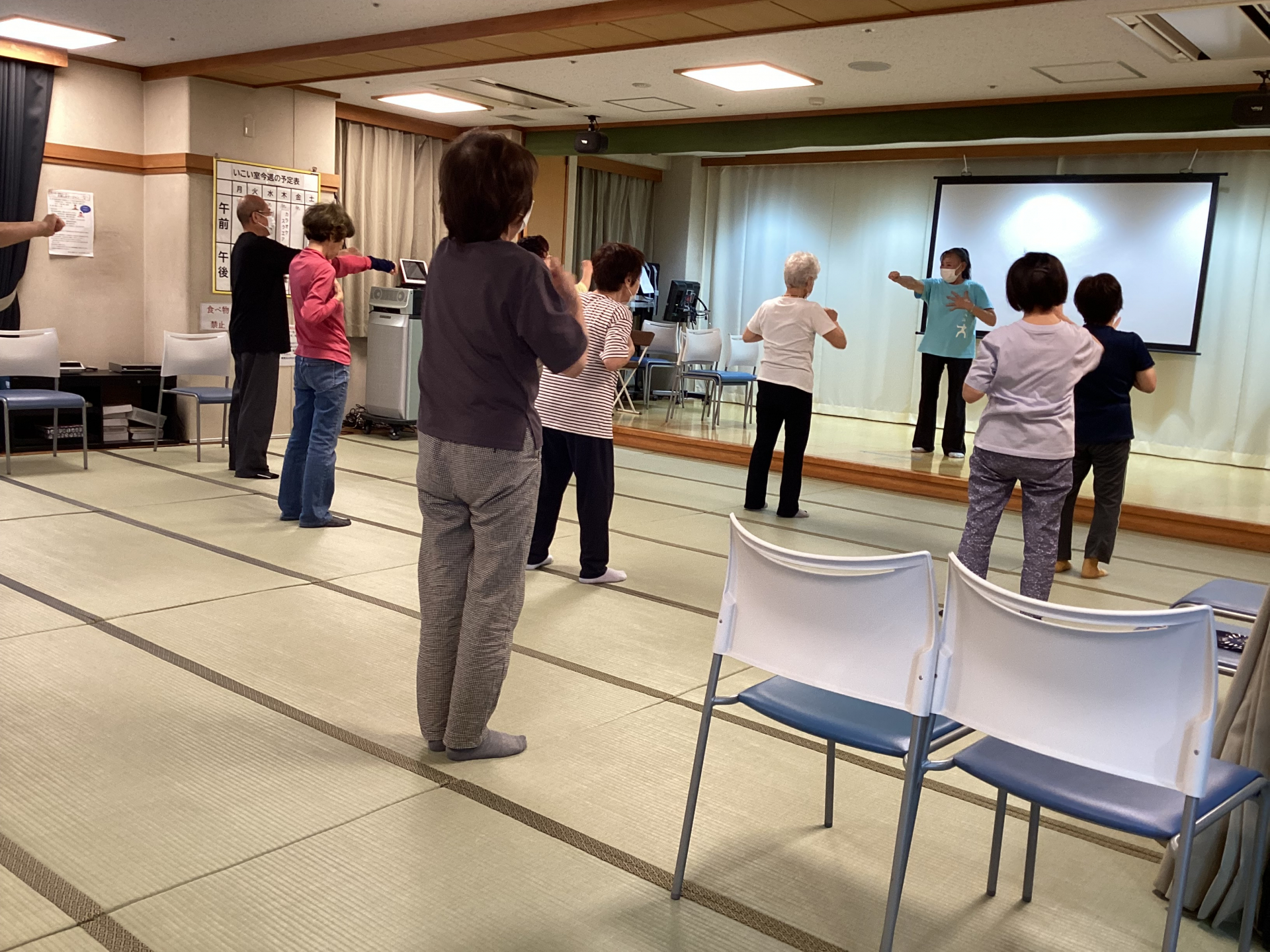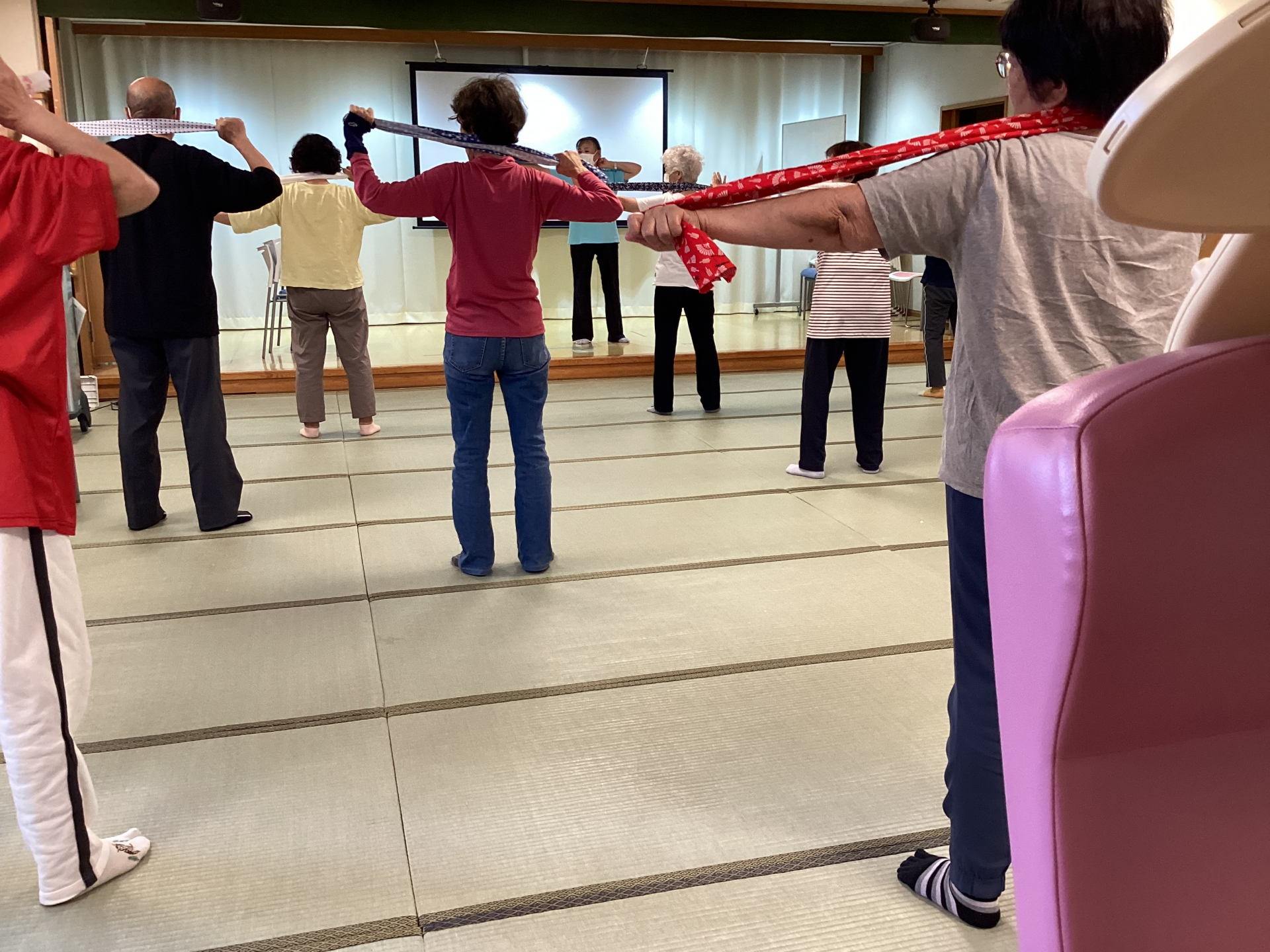 健康息き活き体操は誰にでも簡単にできるリラックス効果tのある腹式呼吸を意識した中国健康保険体操です。時間は90分とたっぷりあり、中にはストレッチや脳トレ、もみほぐし等もあり、終わると全身がすっきり!です。手ぬぐいも使って可動域もアップ↑です。