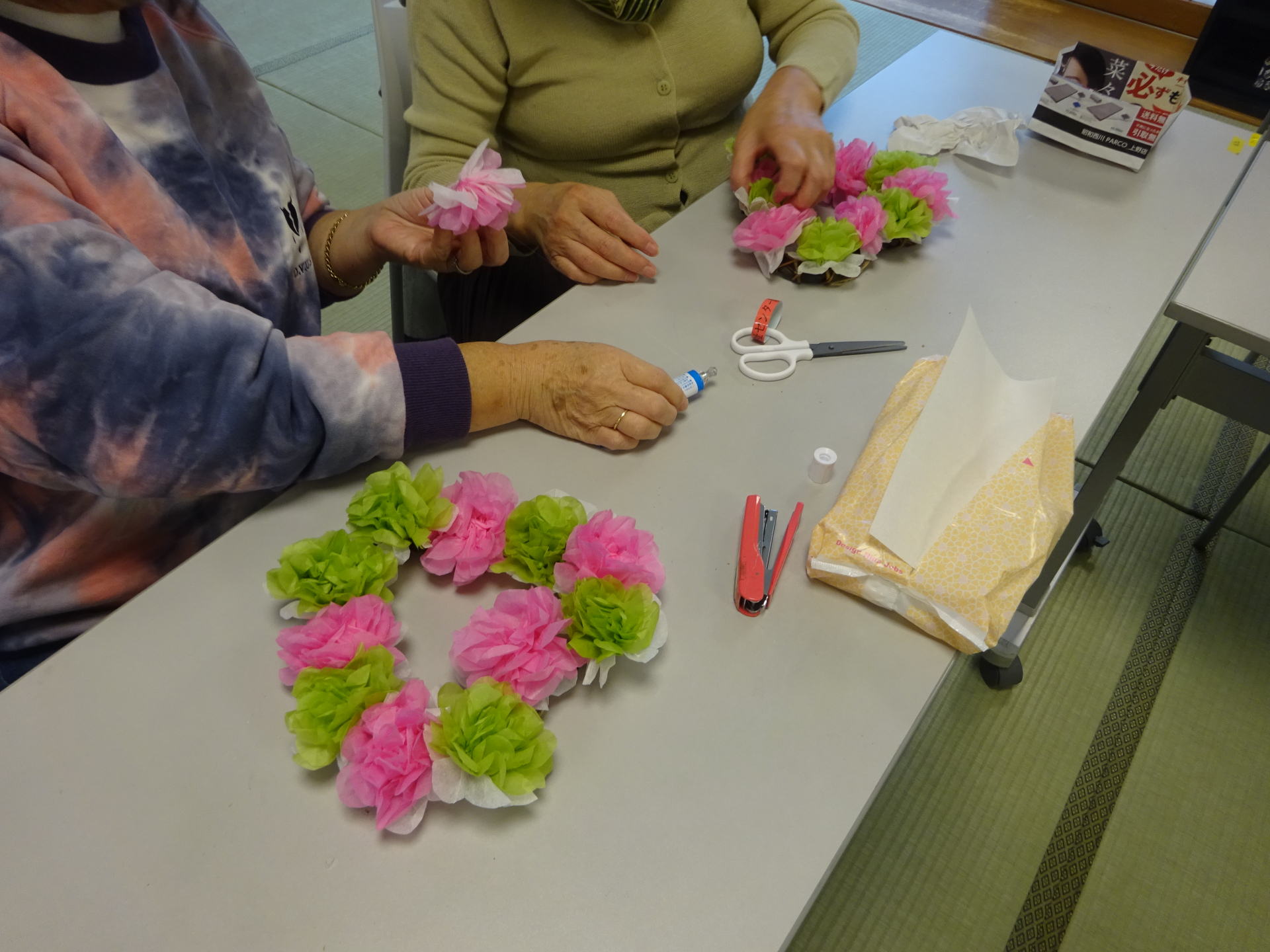 地域交流イベントで、お花紙を使ったハートのリースを作りました!