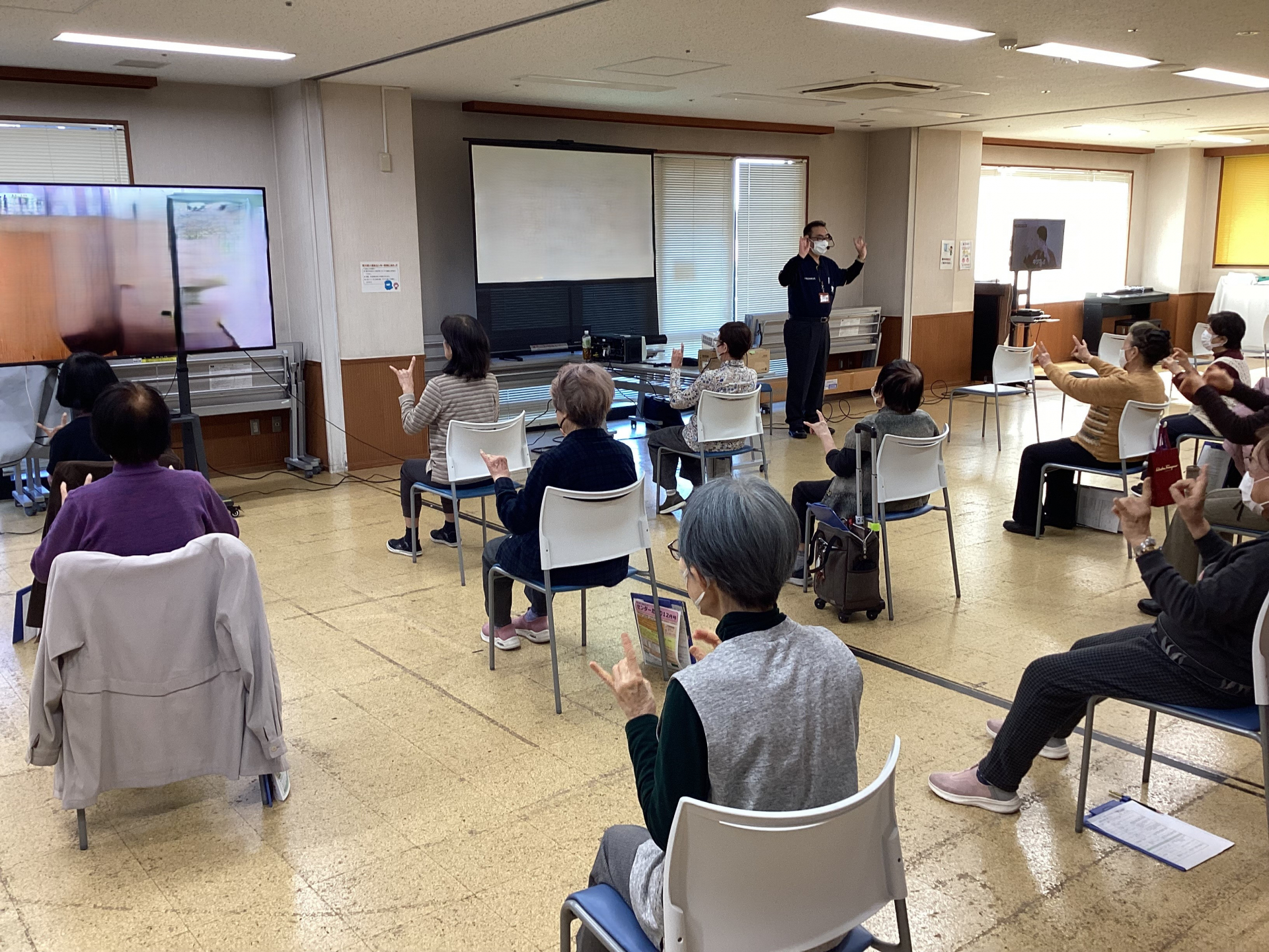 プロジェクターの映像を見ながら、音楽健康指導士の小林勝講師が司会進行役として、
