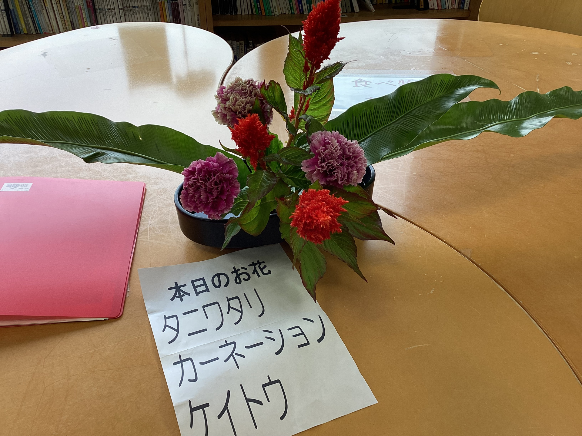 今日のおはな講座で使うおはなは、ながーい葉っぱとふわふわの赤い花と大輪のカーネーション!
