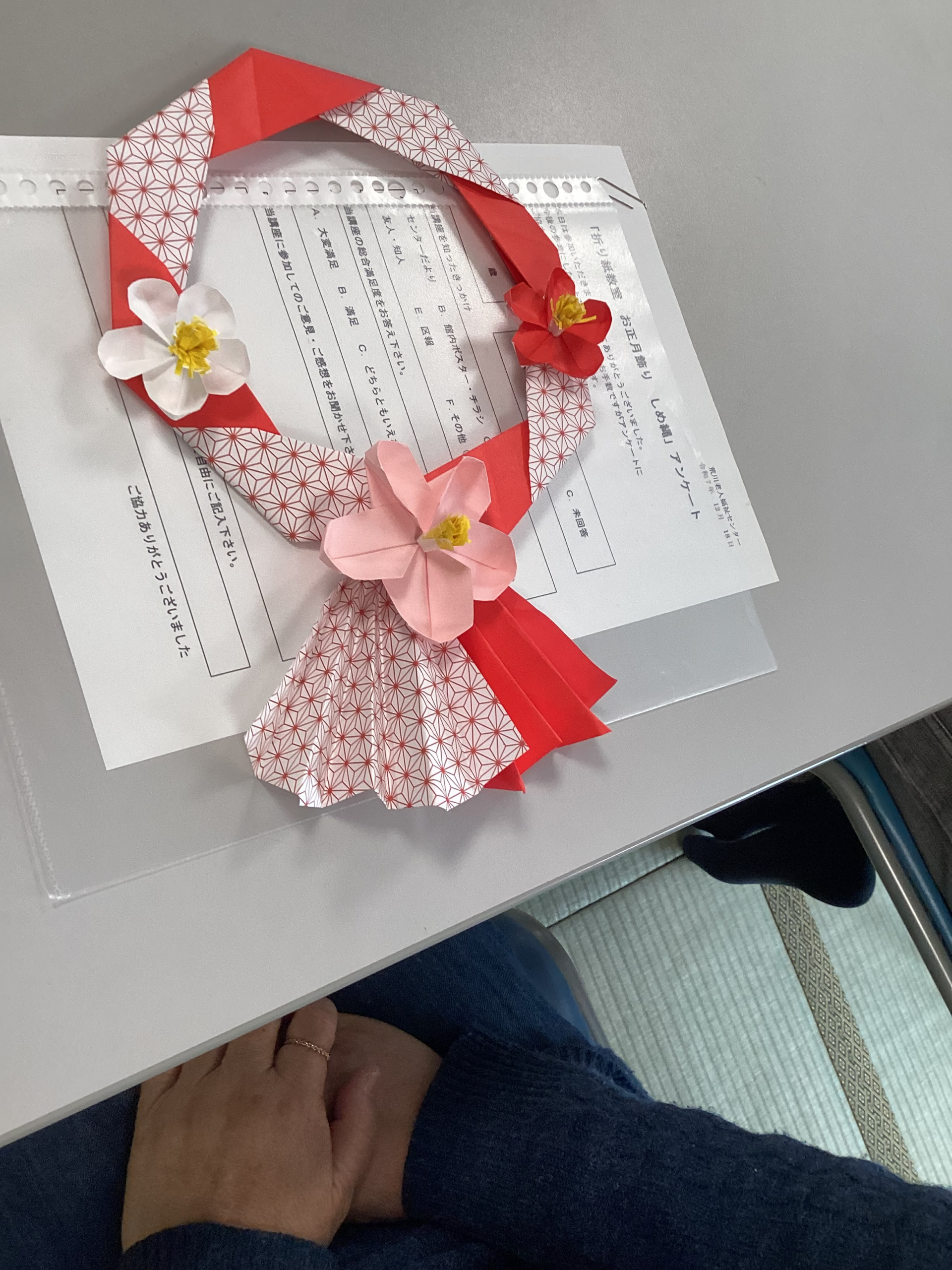 あとは、ジャバラに折った折り紙と、こちらで用意した梅の花の折紙をボンドで貼りつけて…