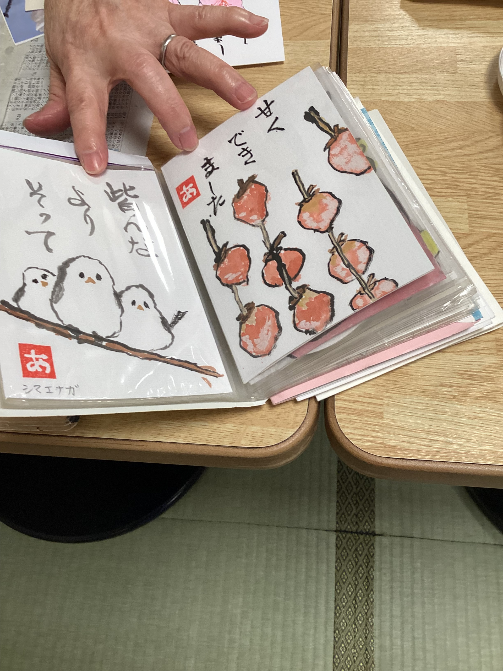 今まで描いた絵手紙を大事にファイルに綴じて持っていらっしゃる方、毎回旬のイチゴやモチーフを持ってきて描いて下さる方等々。皆様すっかり絵手紙の沼にはまり、新たな趣味を見つけられたようで嬉しいです♡