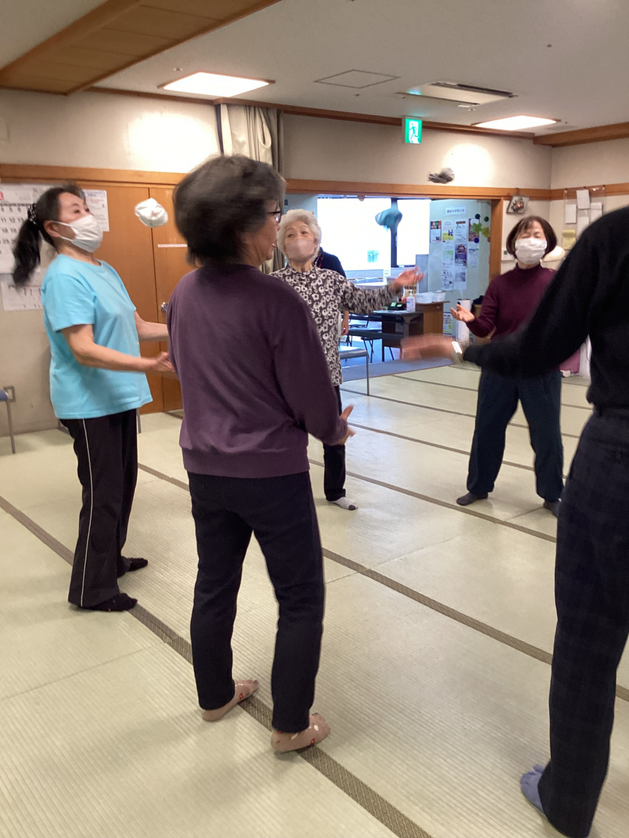 雨の中今期最後のいきいき体操です。手拭いを丸めてボールにして、お隣さんとキャッチボールしています、皆さん楽しそうに笑い声がひびいていました。