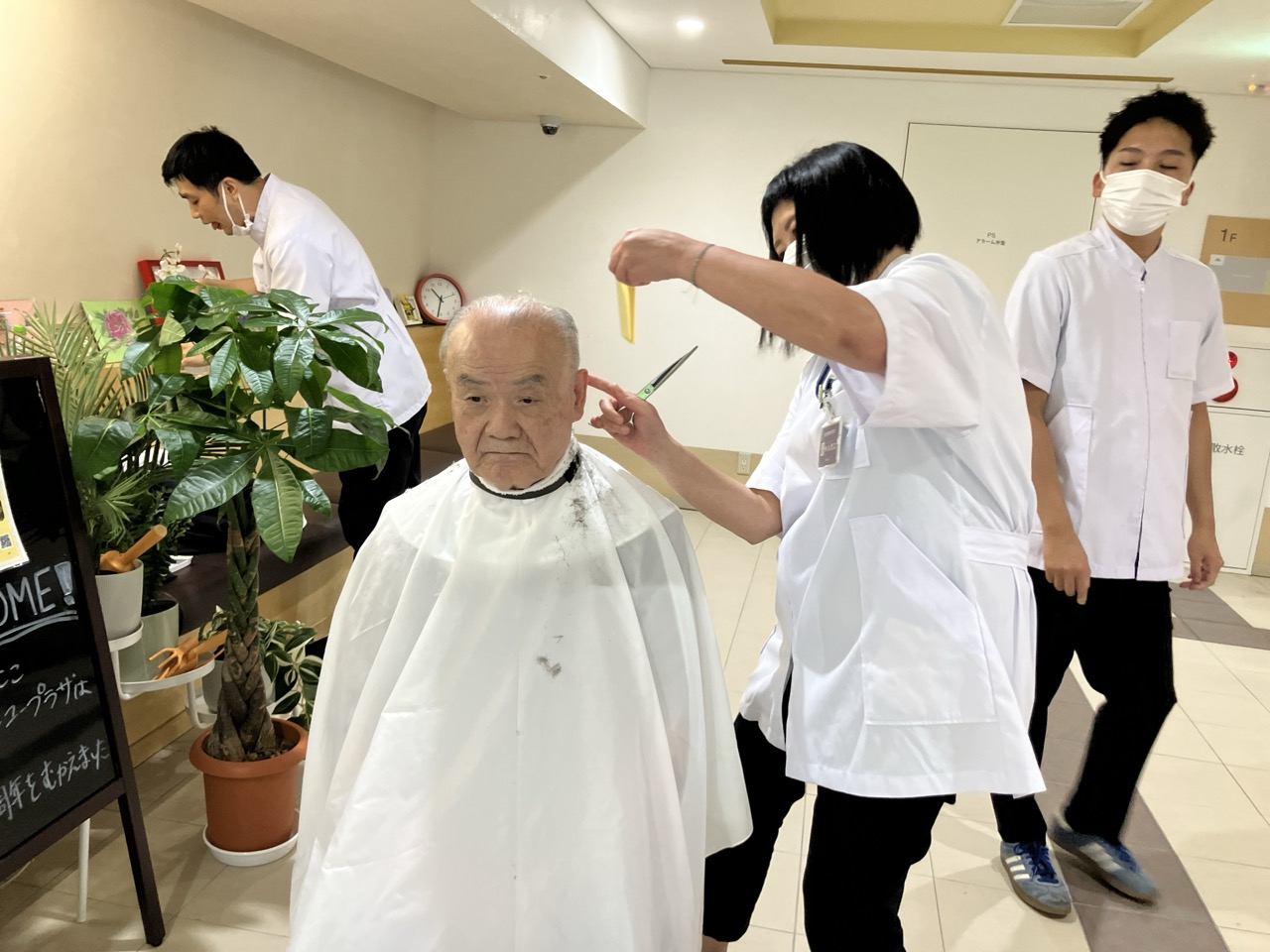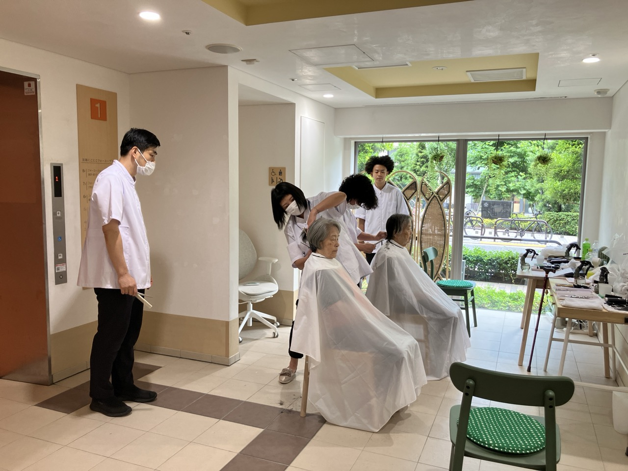 今日は、近隣の東京理容専修学校の先生と生徒の皆さんがヘアカットのボランティアに来てくださいました!