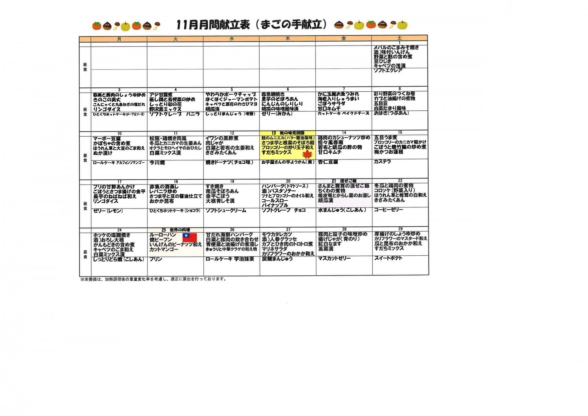 2025.11.01 活動報告 【淡路デイ】11月献立表 Tweet シェアする こんばんは~フォーユーデイサービス淡路です。 いつも当ホームページをご覧いただきありがとうございます。 秋の味覚御膳や世界のご飯シリーズ『ルーローハン』が出ます~ お楽しみに!! 前の記事 2025.11.01 活動報告 【淡路デイ】11月プログラム表 次の記事 2025.10.31 活動報告 【淡路デイ】ハロウィンビンゴ大会! 一覧へ戻る