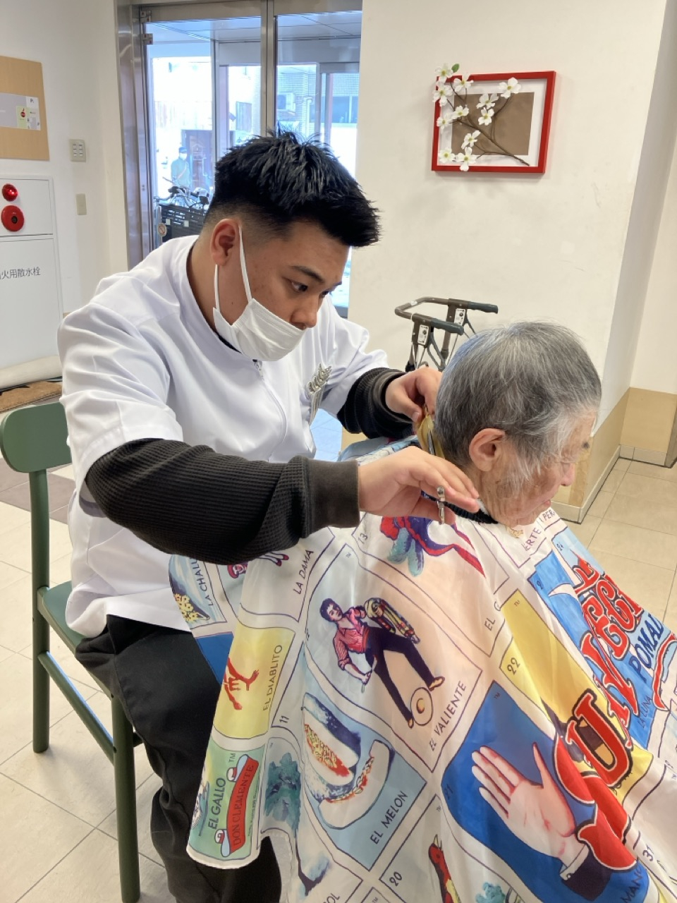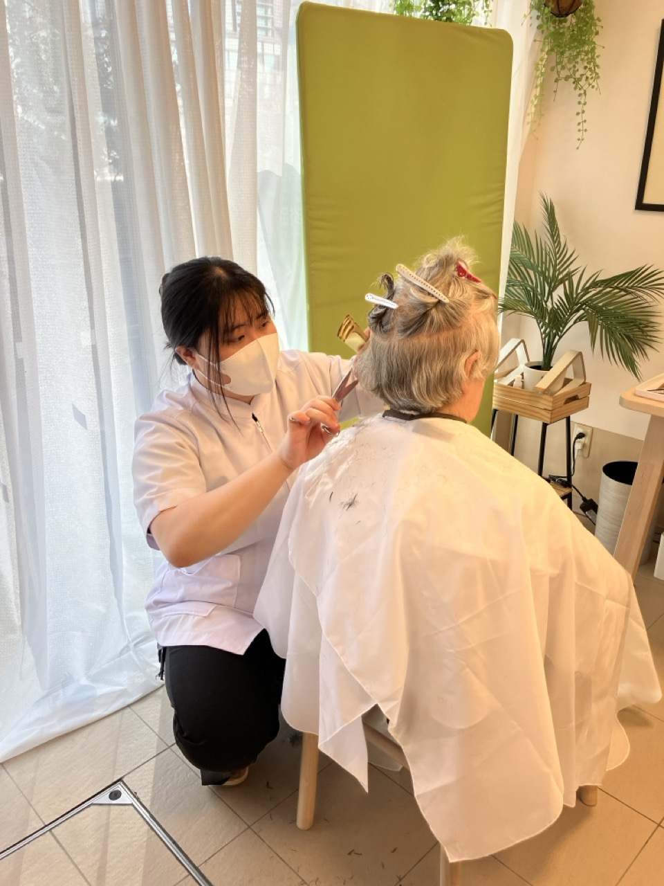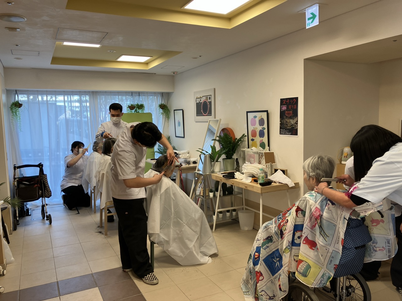 ご利用者様は到着後、水分補給をしバイタル測定後、ヘアカットへと向かいます。