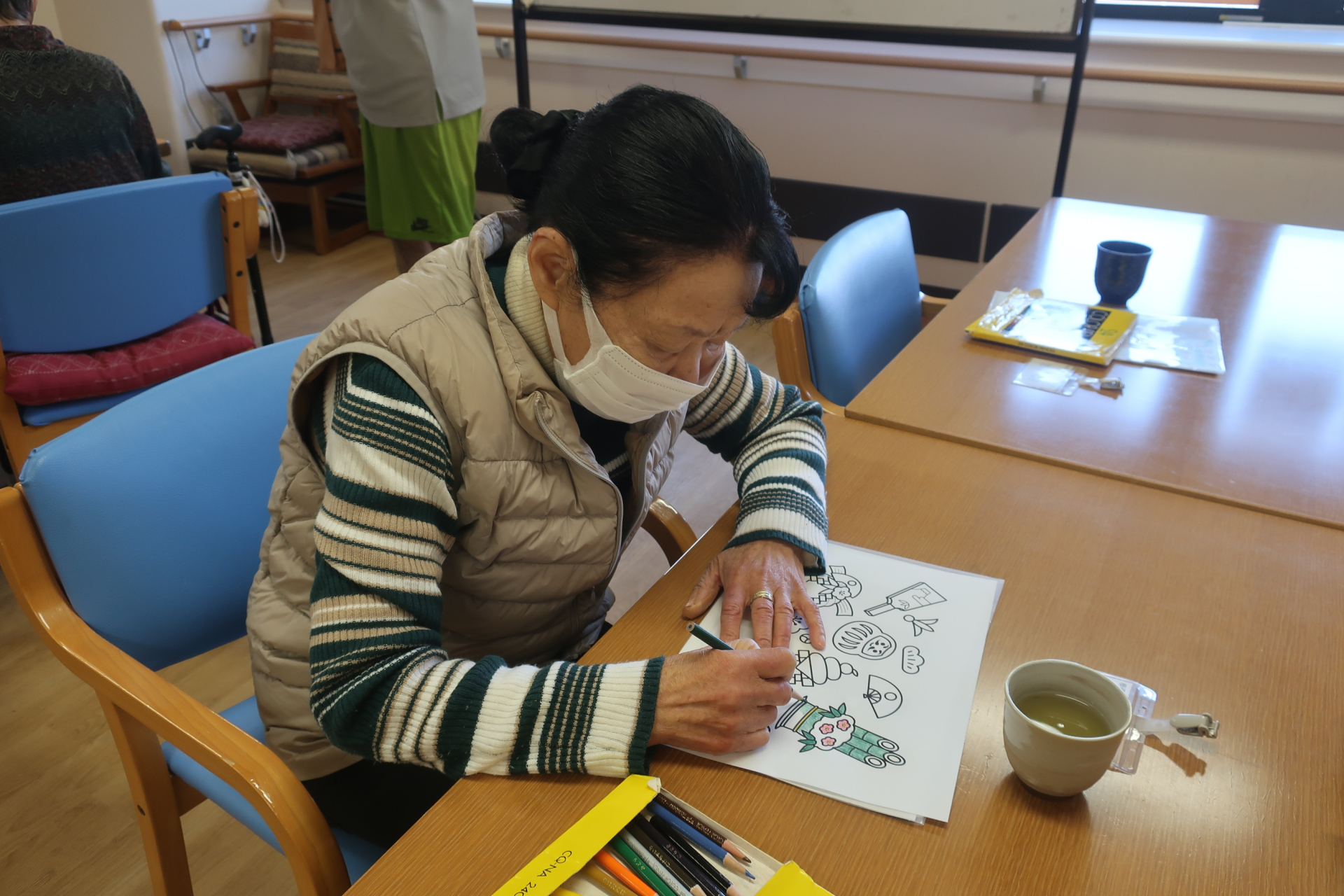 お仲間と談笑されたり、パズルをされたり、塗り絵をされ過ごされております。中でも塗り絵が人気です。お正月や節分などの季節を感じる行事や、風物などを取り入れて楽しんでいただいております。中には、十二支の塗のイラストごとに、十二支の漢字を書いておられるご利用者様がおられ、とても関心させられました。