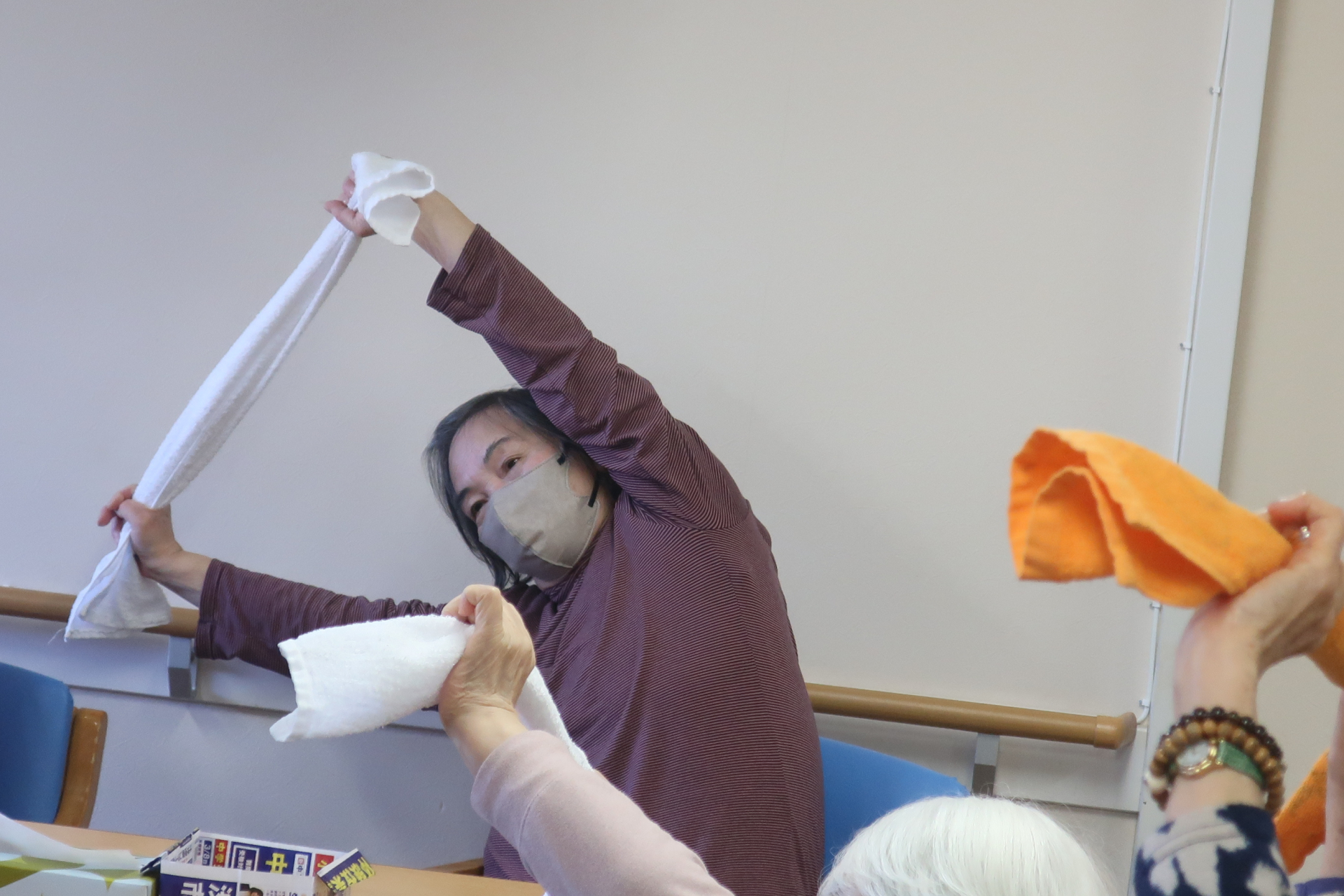 後半は、ゲームの要素も取り入れて、皆さん一生懸命にタオル掴みゲームに取り組まれていらっしゃいました。