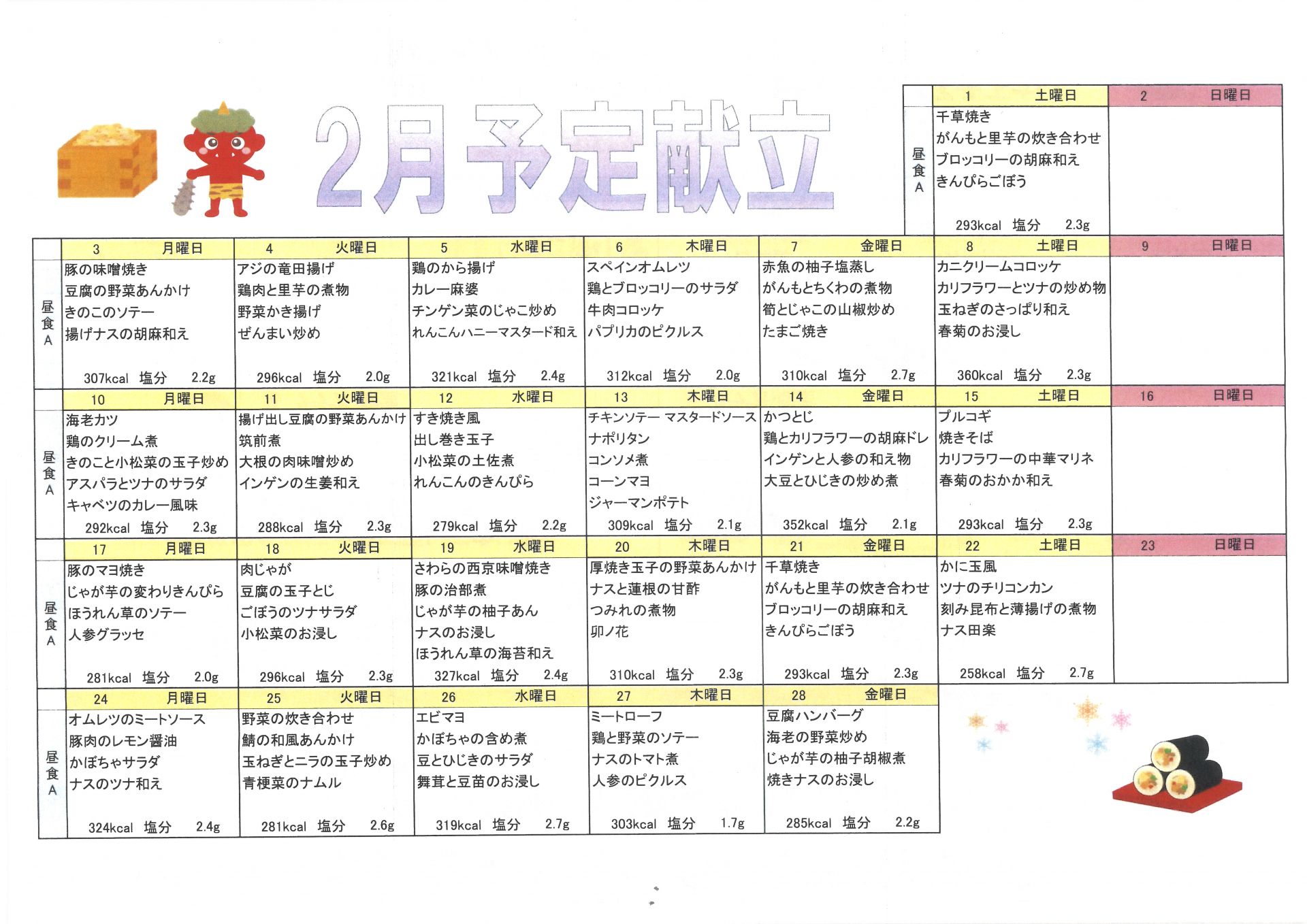 2025.02.03 活動報告 【センター北】2月昼食メニュー予定表です。 Tweet シェアする 2月の昼食献立予定です。 お魚が食べれない。お肉は苦手で・・・などありましたら ご相談ください!対応させて頂きます。 センター北 周藤 前の記事 2025.02.03 活動報告 【センター北】締切もうすぐ! 次の記事 2025.02.03 活動報告 【デイサービスセンター北】セン北 大節分祭開催っ!! 一覧へ戻る