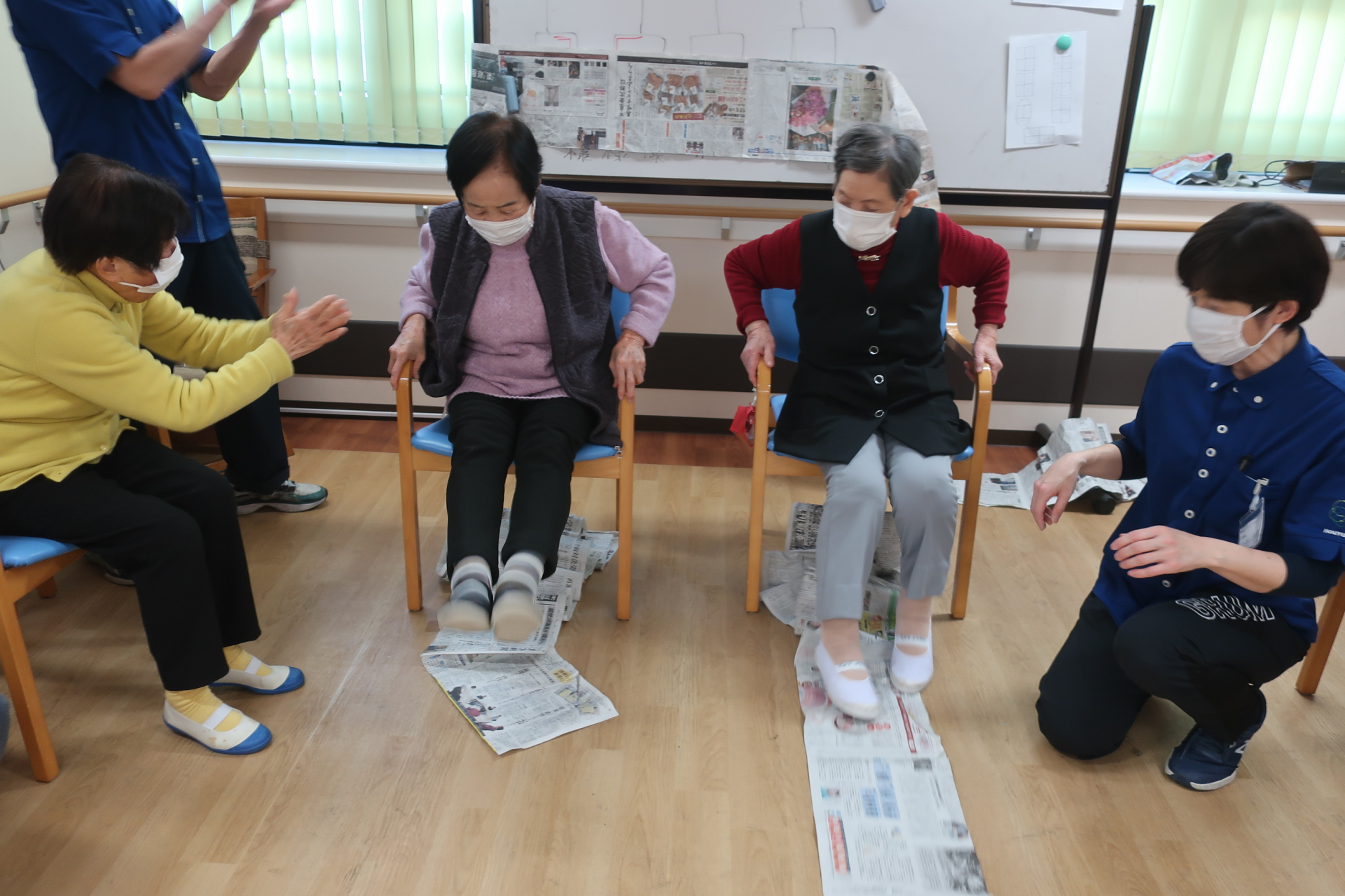 賑やかな声が聞こえてきました。新聞足漕ぎゲーム。