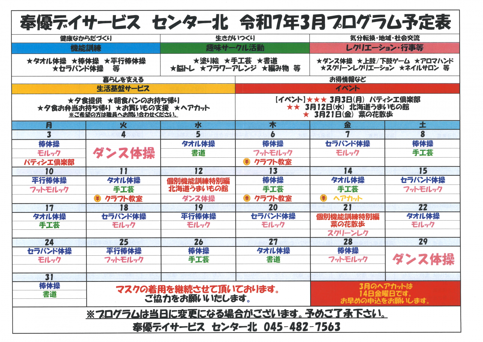 【センター北】3月プログラム表【ヘアカットは3/14】