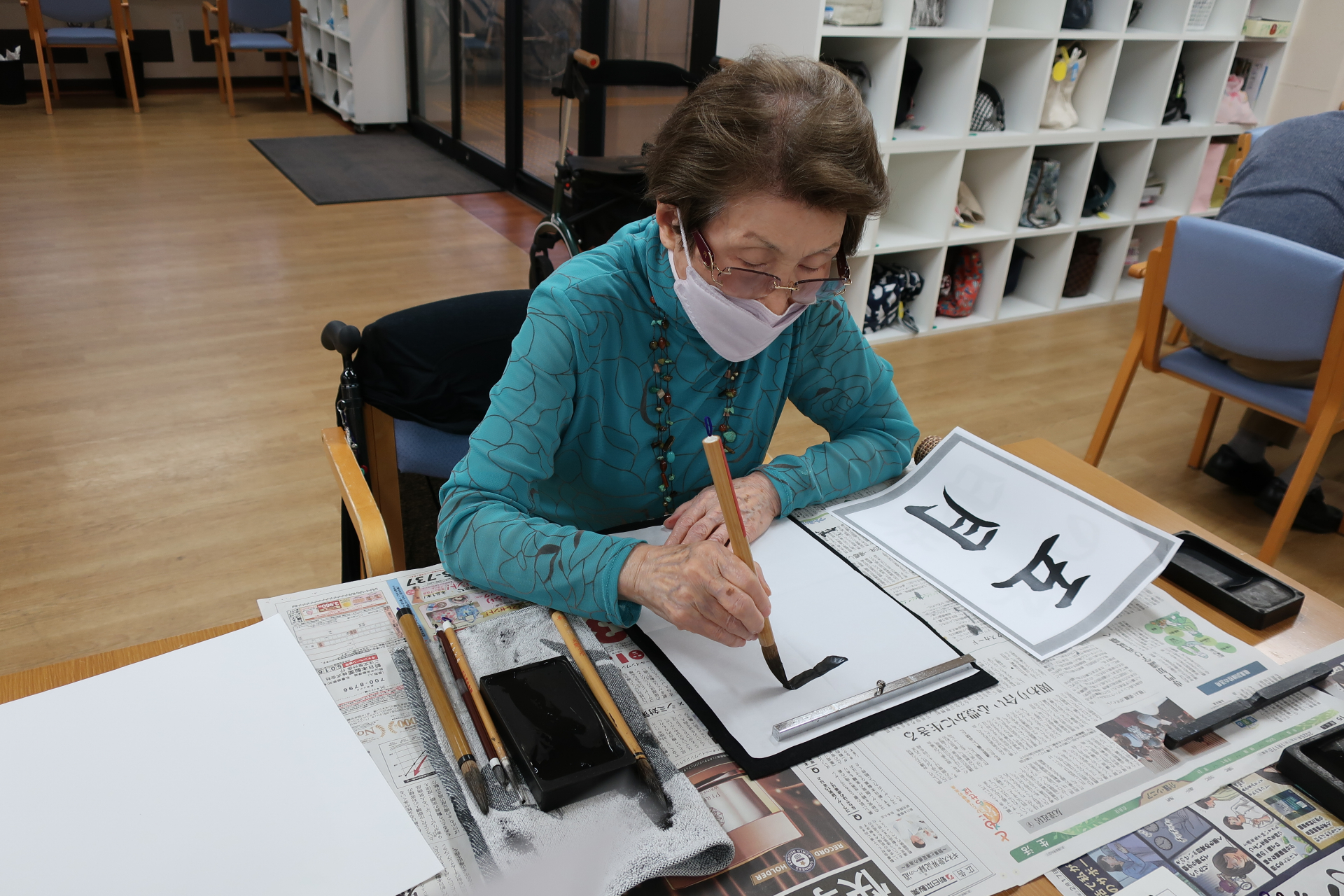本日の個別レクリエーションは、書道とタオル体操! 書道では、5月初めと言う事で「さつき!」です。