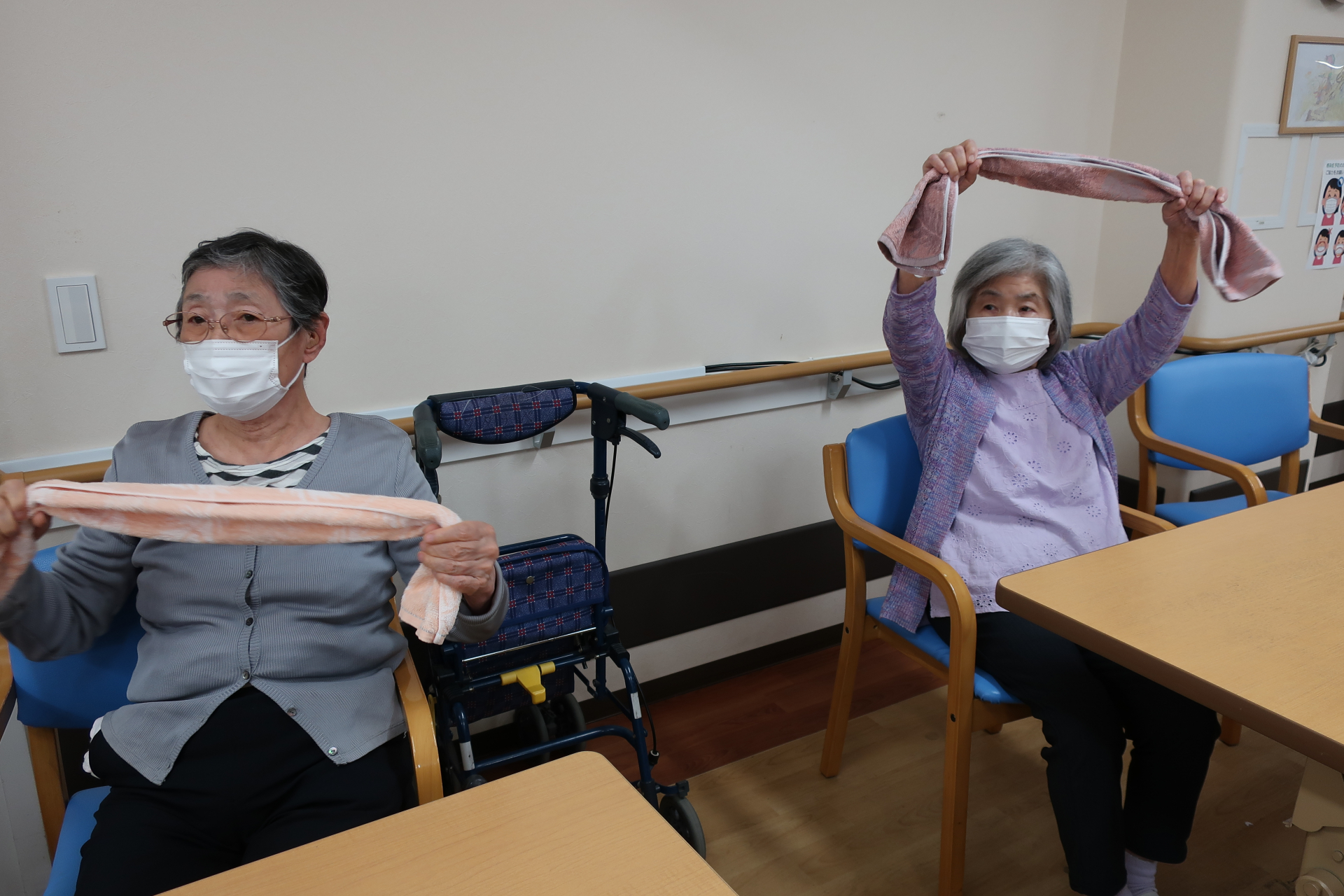 書道の傍らでは、タオル体操です。今日は、ドリフターズの「いい湯だなぁ」の曲に乗って皆さん、身体を動かしています。